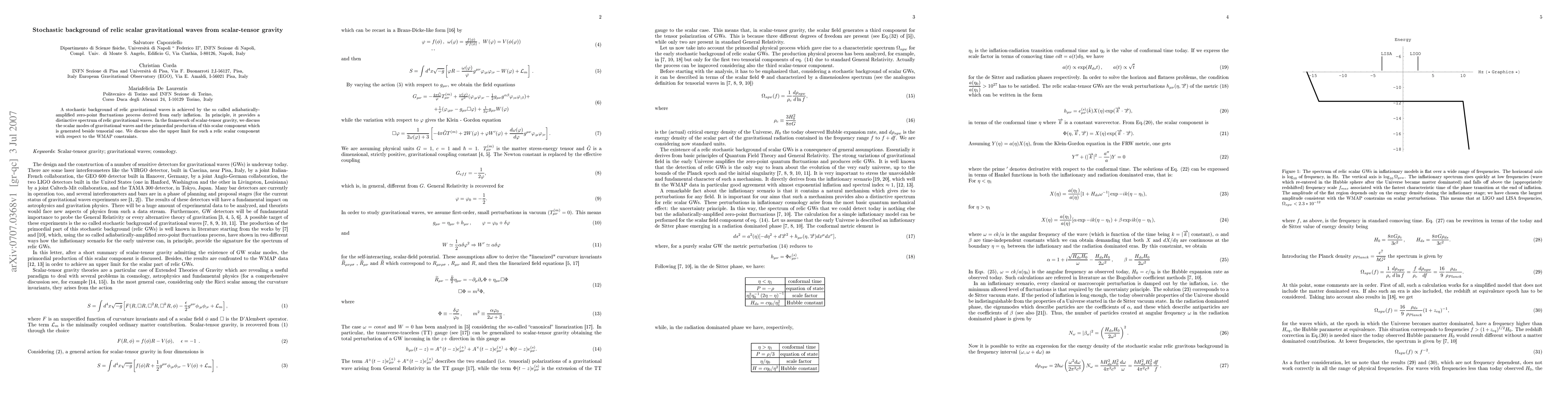 A stochastic background of relic gravitational waves is achieved by the so called adiabatically-amplified zero-point fluctuations process derived from early inflation. In principle, it provides a distinctive spectrum of relic gravitational waves. In the framework of scalar-tensor gravity, we discuss the scalar modes of gravitational waves and the primordial production of this scalar component which is generated beside tensorial one. We discuss also the upper limit for such a relic scalar component with respect to the WMAP constraints.