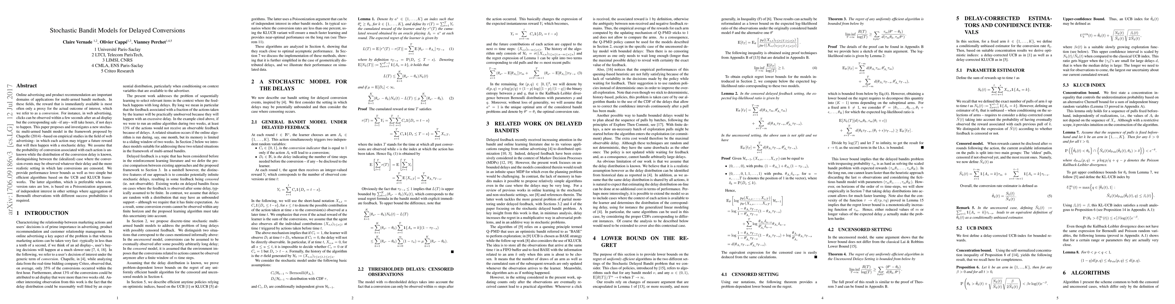 Online advertising and product recommendation are important domains of applications for multi-armed bandit methods. In these fields, the reward that is immediately available is most often only a proxy for the actual outcome of interest, which we refer to as a conversion. For instance, in web advertising, clicks can be observed within a few seconds after an ad display but the corresponding sale --if any-- will take hours, if not days to happen. This paper proposes and investigates a new stochas-tic multi-armed bandit model in the framework proposed by Chapelle (2014) --based on empirical studies in the field of web advertising-- in which each action may trigger a future reward that will then happen with a stochas-tic delay. We assume that the probability of conversion associated with each action is unknown while the distribution of the conversion delay is known, distinguishing between the (idealized) case where the conversion events may be observed whatever their delay and the more realistic setting in which late conversions are censored. We provide performance lower bounds as well as two simple but efficient algorithms based on the UCB and KLUCB frameworks. The latter algorithm, which is preferable when conversion rates are low, is based on a Poissonization argument, of independent interest in other settings where aggregation of Bernoulli observations with different success probabilities is required.