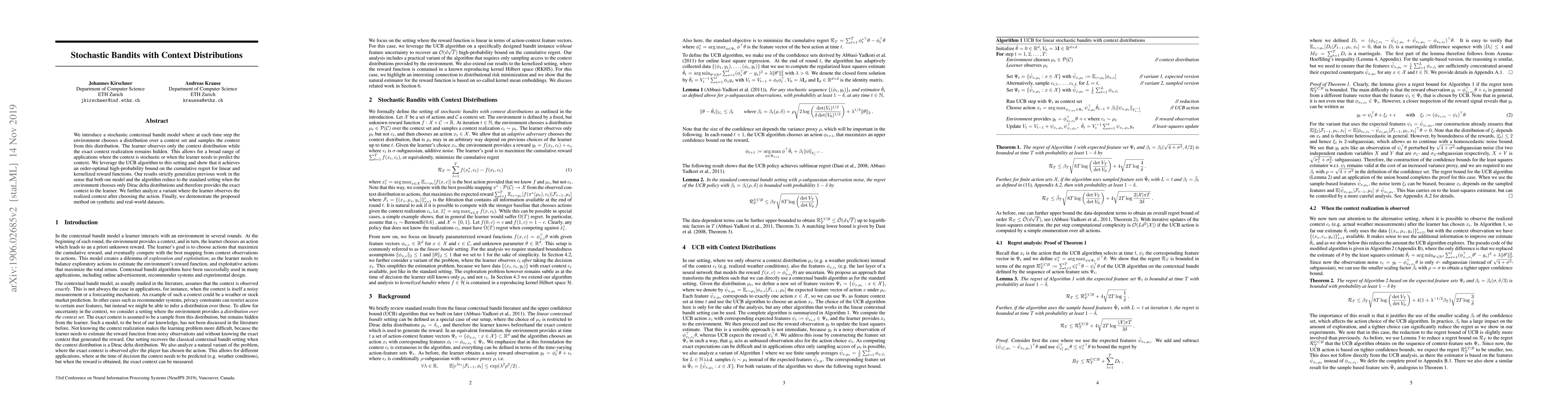 Researchers introduced a new stochastic contextual bandit model where the environment chooses a distribution over a context set, allowing for prediction of the context. They show that the UCB algorithm achieves an order-optimal high-probability bound on cumulative regret for linear and kernelized reward functions.