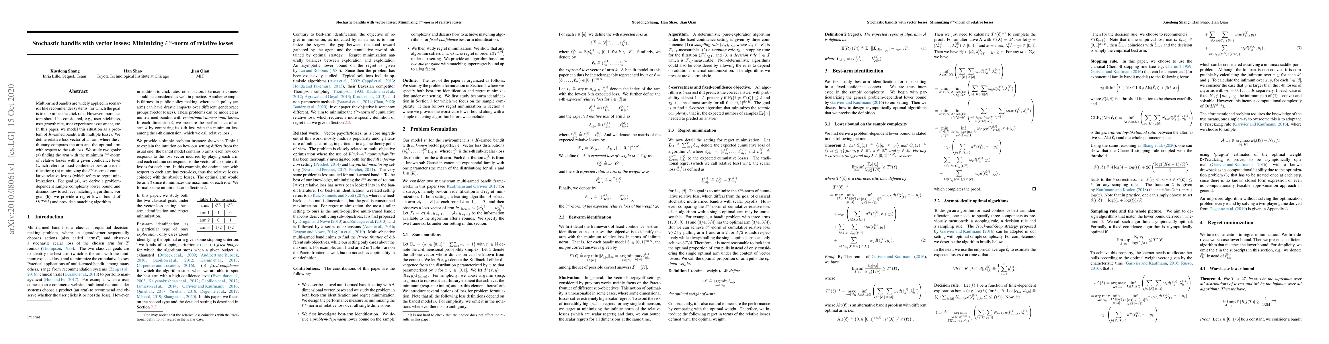 Multi-armed bandits are widely applied in scenarios like recommender systems, for which the goal is to maximize the click rate. However, more factors should be considered, e.g., user stickiness, user growth rate, user experience assessment, etc. In this paper, we model this situation as a problem of $K$-armed bandit with multiple losses. We define relative loss vector of an arm where the $i$-th entry compares the arm and the optimal arm with respect to the $i$-th loss. We study two goals: (a) finding the arm with the minimum $\ell^\infty$-norm of relative losses with a given confidence level (which refers to fixed-confidence best-arm identification); (b) minimizing the $\ell^\infty$-norm of cumulative relative losses (which refers to regret minimization). For goal (a), we derive a problem-dependent sample complexity lower bound and discuss how to achieve matching algorithms. For goal (b), we provide a regret lower bound of $\Omega(T^{2/3})$ and provide a matching algorithm.