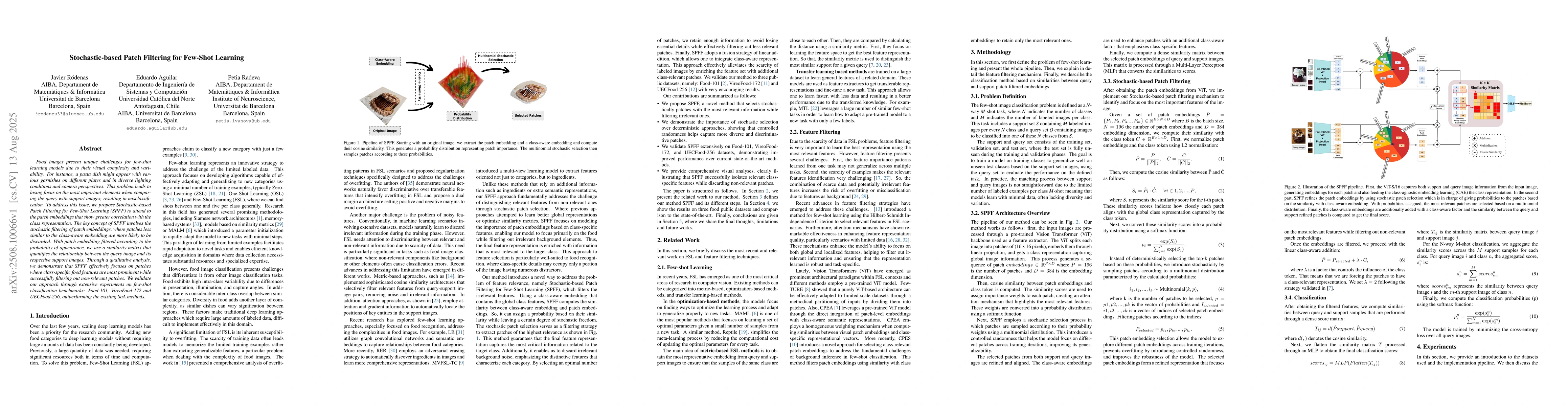 Food images present unique challenges for few-shot learning models due to their visual complexity and variability. For instance, a pasta dish might appear with various garnishes on different plates and in diverse lighting conditions and camera perspectives. This problem leads to losing focus on the most important elements when comparing the query with support images, resulting in misclassification. To address this issue, we propose Stochastic-based Patch Filtering for Few-Shot Learning (SPFF) to attend to the patch embeddings that show greater correlation with the class representation. The key concept of SPFF involves the stochastic filtering of patch embeddings, where patches less similar to the class-aware embedding are more likely to be discarded. With patch embedding filtered according to the probability of appearance, we use a similarity matrix that quantifies the relationship between the query image and its respective support images. Through a qualitative analysis, we demonstrate that SPFF effectively focuses on patches where class-specific food features are most prominent while successfully filtering out non-relevant patches. We validate our approach through extensive experiments on few-shot classification benchmarks: Food-101, VireoFood-172 and UECFood-256, outperforming the existing SoA methods.