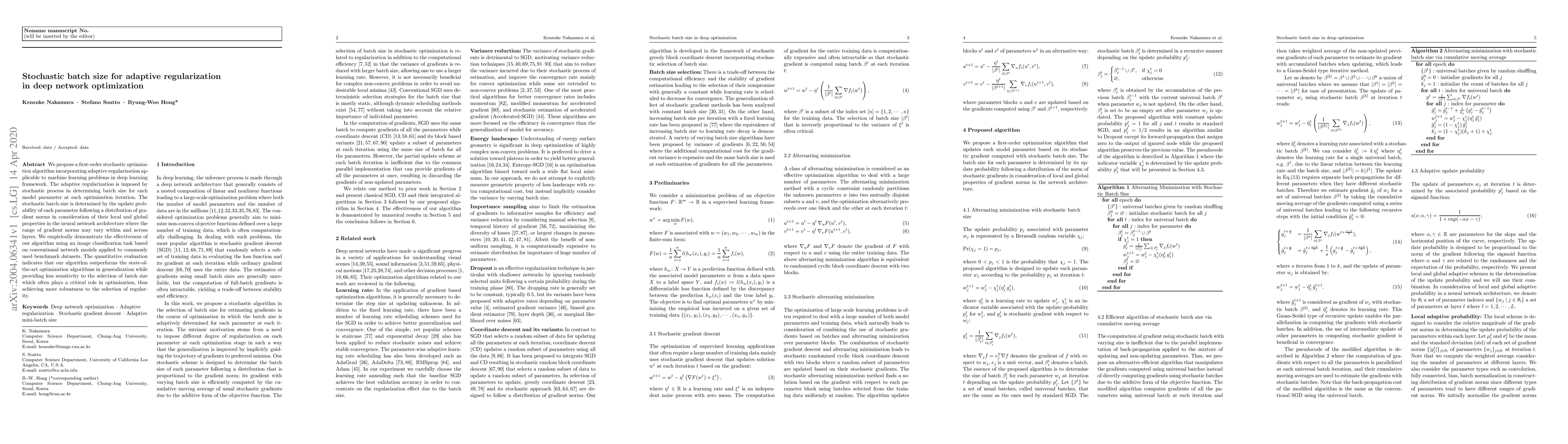 We propose a first-order stochastic optimization algorithm incorporating adaptive regularization applicable to machine learning problems in deep learning framework. The adaptive regularization is imposed by stochastic process in determining batch size for each model parameter at each optimization iteration. The stochastic batch size is determined by the update probability of each parameter following a distribution of gradient norms in consideration of their local and global properties in the neural network architecture where the range of gradient norms may vary within and across layers. We empirically demonstrate the effectiveness of our algorithm using an image classification task based on conventional network models applied to commonly used benchmark datasets. The quantitative evaluation indicates that our algorithm outperforms the state-of-the-art optimization algorithms in generalization while providing less sensitivity to the selection of batch size which often plays a critical role in optimization, thus achieving more robustness to the selection of regularity.