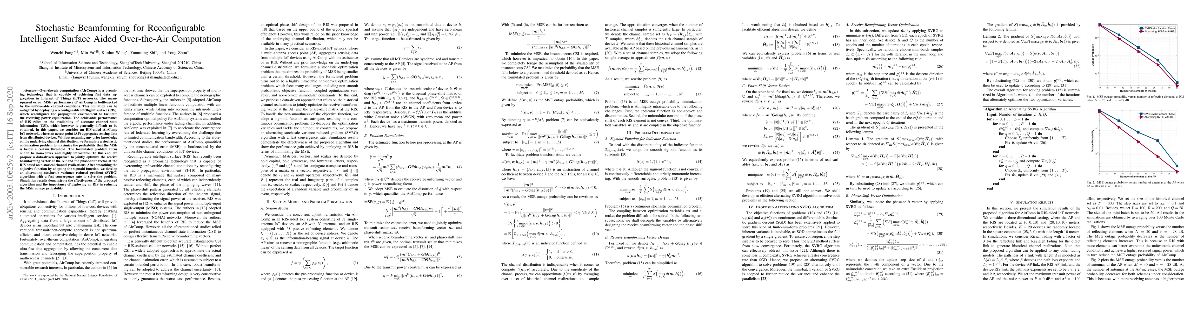 This paper proposes a stochastic optimization approach for reconfigurable intelligent surface (RIS) aided over-the-air computation in IoT networks, aiming to maximize the probability of mean-squared error (MSE) below a threshold. An alternating stochastic variance reduced gradient (SVRG) algorithm is developed to solve the non-convex problem, demonstrating reduced MSE outage probability through simulations.