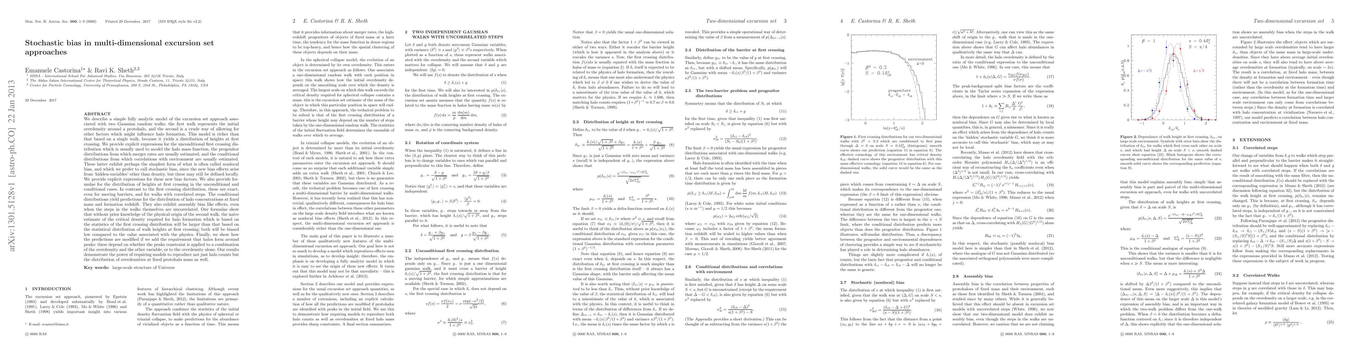We describe a simple fully analytic model of the excursion set approach associated with two Gaussian random walks: the first walk represents the initial overdensity around a protohalo, and the second is a crude way of allowing for other factors which might influence halo formation. This model is richer than that based on a single walk, because it yields a distribution of heights at first crossing. We provide explicit expressions for the unconditional first crossing distribution which is usually used to model the halo mass function, the progenitor distributions, and the conditional distributions from which correlations with environment are usually estimated. These latter exhibit perhaps the simplest form of what is often called nonlocal bias, and which we prefer to call stochastic bias, since the new bias effects arise from `hidden-variables' other than density, but these may still be defined locally. We provide explicit expressions for these new bias factors. We also provide formulae for the distribution of heights at first crossing in the unconditional and conditional cases. In contrast to the first crossing distribution, these are exact, even for moving barriers, and for walks with correlated steps. The conditional distributions yield predictions for the distribution of halo concentrations at fixed mass and formation redshift. They also exhibit assembly bias like effects, even when the steps in the walks themselves are uncorrelated. Finally, we show how the predictions are modified if we add the requirement that halos form around peaks: these depend on whether the peaks constraint is applied to a combination of the overdensity and the other variable, or to the overdensity alone. Our results demonstrate the power of requiring models to reproduce not just halo counts but the distribution of overdensities at fixed protohalo mass as well.