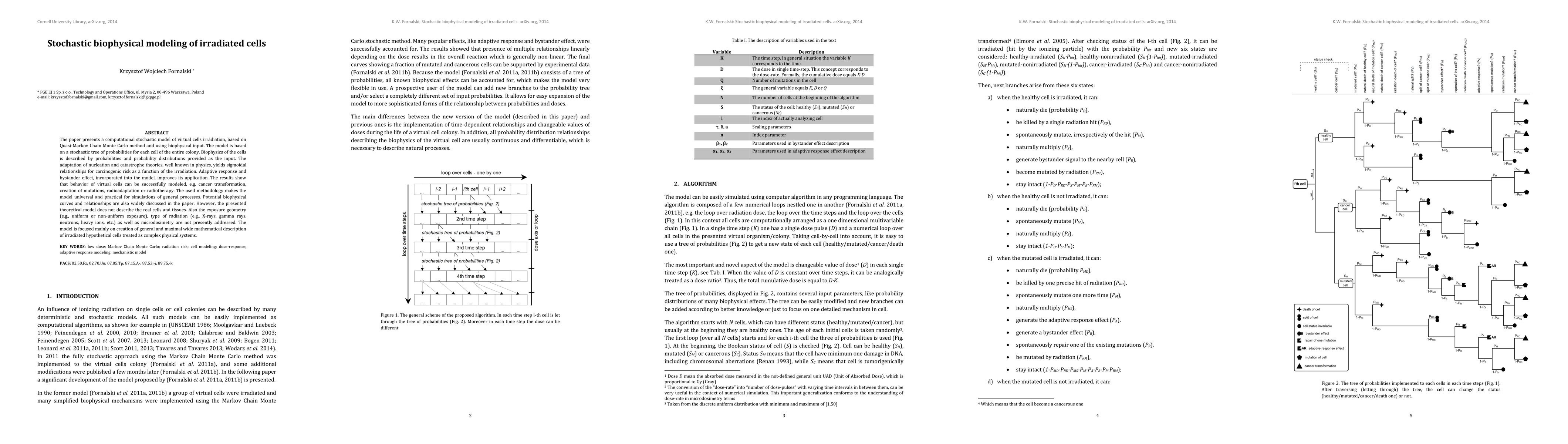 The paper presents a computational stochastic model of virtual cells irradiation, based on Quasi-Markov Chain Monte Carlo method and using biophysical input. The model is based on a stochastic tree of probabilities for each cell of the entire colony. Biophysics of the cells is described by probabilities and probability distributions provided as the input. The adaptation of nucleation and catastrophe theories, well known in physics, yields sigmoidal relationships for carcinogenic risk as a function of the irradiation. Adaptive response and bystander effect, incorporated into the model, improves its application. The results show that behavior of virtual cells can be successfully modeled, e.g. cancer transformation, creation of mutations, radioadaptation or radiotherapy. The used methodology makes the model universal and practical for simulations of general processes. Potential biophysical curves and relationships are also widely discussed in the paper. However, the presented theoretical model does not describe the real cells and tissues. Also the exposure geometry (e.g., uniform or non-uniform exposure), type of radiation (e.g., X-rays, gamma rays, neutrons, heavy ions, etc.) as well as microdosimetry are not presently addressed. The model is focused mainly on creation of general and maximal wide mathematical description of irradiated hypothetical cells treated as complex physical systems.