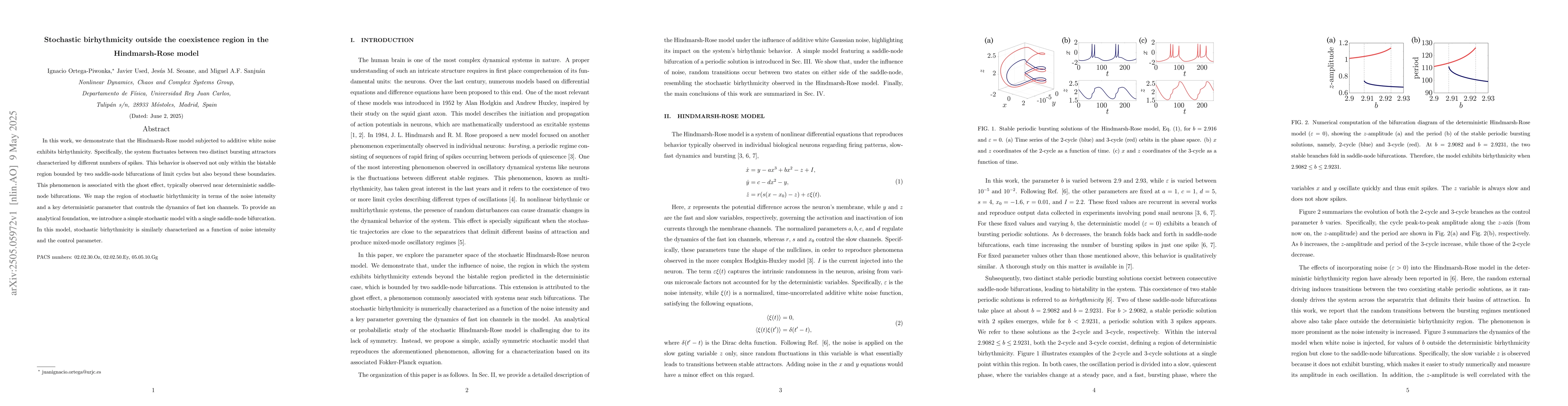 The research employs the Hindmarsh-Rose model subjected to additive white noise, mapping the region of stochastic birhythmicity in terms of noise intensity and a key deterministic parameter controlling fast ion channels. A simple stochastic model with a single saddle-node bifurcation is introduced to provide an analytical foundation.
