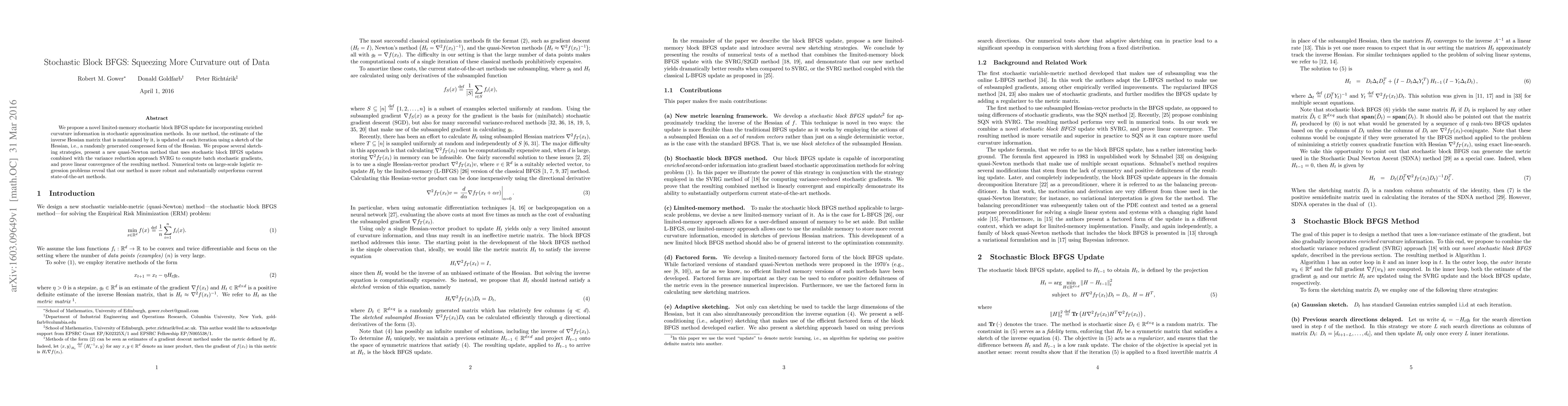 This paper introduces a novel limited-memory stochastic block BFGS update method that incorporates enriched curvature information in stochastic optimization. The method uses sketching strategies to compress Hessian information and combines it with SVRG for batch stochastic gradients, achieving linear convergence and outperforming current state-of-the-art methods in large-scale logistic regression.