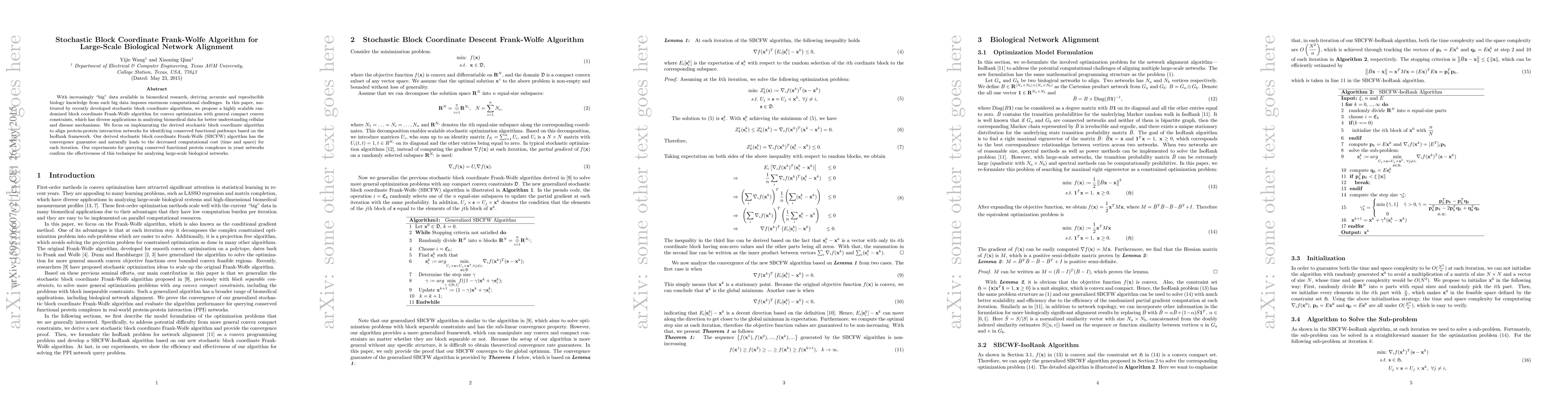 The paper proposes a stochastic block coordinate Frank-Wolfe (SBCFW) algorithm for convex optimization with general compact convex constraints, applied to the IsoRank framework for aligning protein-protein interaction networks.