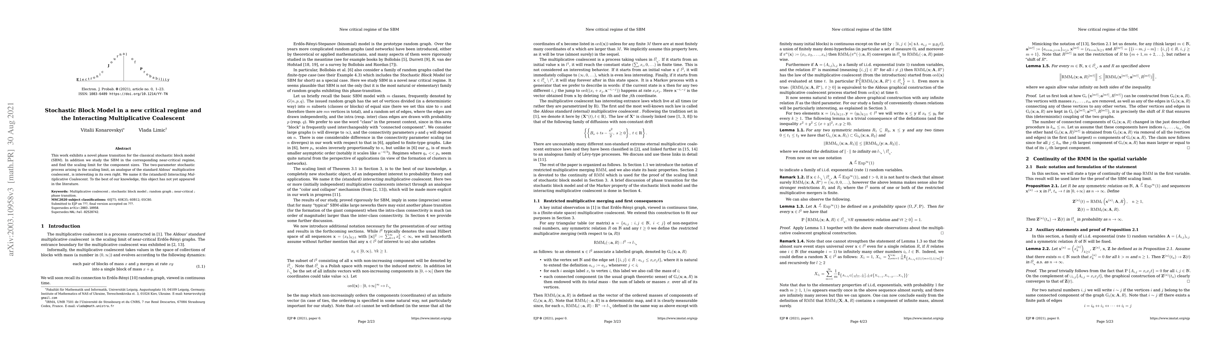 This work exhibits a novel phase transition for the classical stochastic block model (SBM). In addition we study the SBM in the corresponding near-critical regime, and find the scaling limit for the component sizes. The two-parameter stochastic process arising in the scaling limit, an analogue of the standard Aldous' multiplicative coalescent, is interesting in its own right. We name it the (standard) Interacting Multiplicative Coalescent. To the best of our knowledge, this object has not yet appeared in the literature.