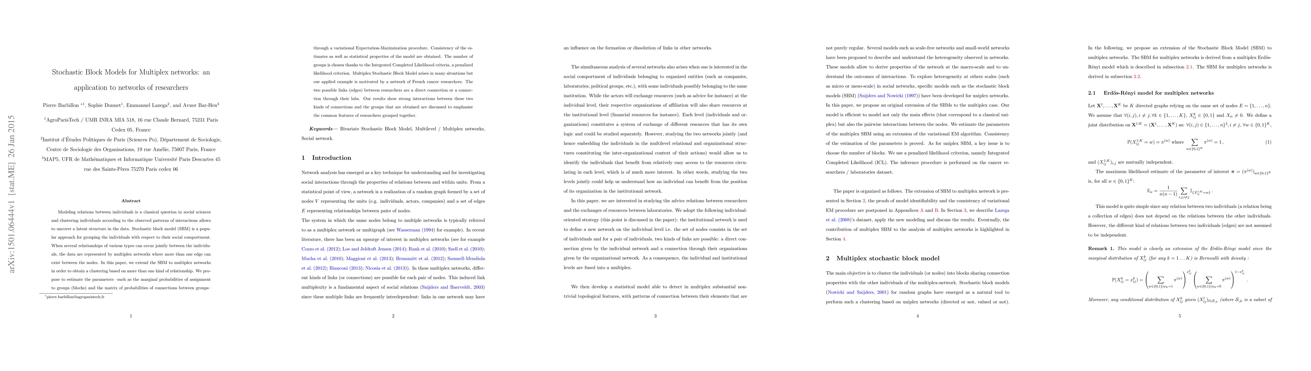 This paper extends the Stochastic Block Model to multiplex networks for clustering individuals based on multiple types of relationships. The authors propose a variational Expectation-Maximization procedure for estimating model parameters and apply the method to a network of French cancer researchers, revealing strong interactions between direct and lab-mediated connections.