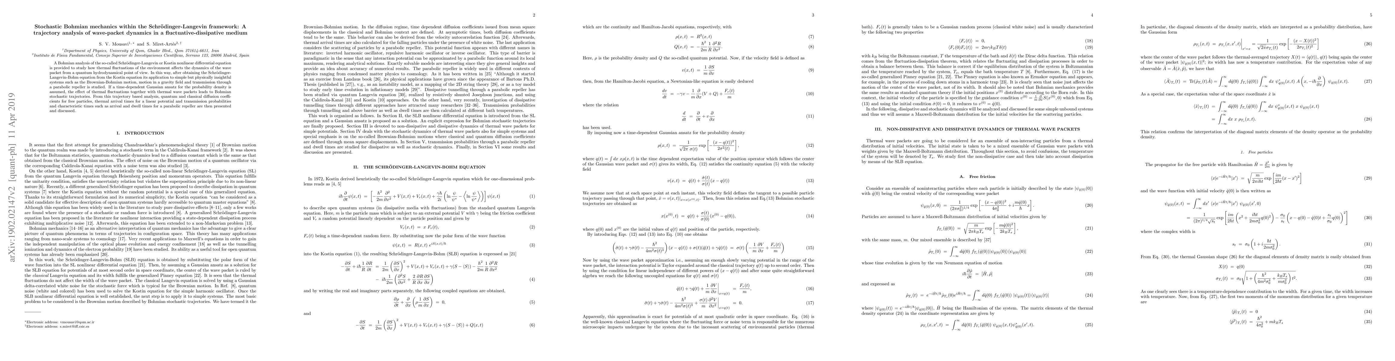 A Bohmian analysis of the so-called Schr\"{o}dinger-Langevin or Kostin nonlinear differential equation is provided to study how thermal fluctuations of the environment affects the dynamics of the wave packet from a quantum hydrodynamical point of view. In this way, after obtaining the Schr\"{o}dinger-Langevin-Bohm equation from the Kostin equation its application to simple but physically insightful systems such as the Brownian-Bohmian motion, motion in a gravity field and transmission through a parabolic repeller is studied. % If a time-dependent Gaussian ansatz for the probability density is assumed, the effect of thermal fluctuations together with thermal wave packets leads to Bohmian stochastic trajectories. From this trajectory based analysis, quantum and classical diffusion coefficients for free particles, thermal arrival times for a linear potential and transmission probabilities and characteristic times such as arrival and dwell times for a parabolic repeller are then presented and discussed.