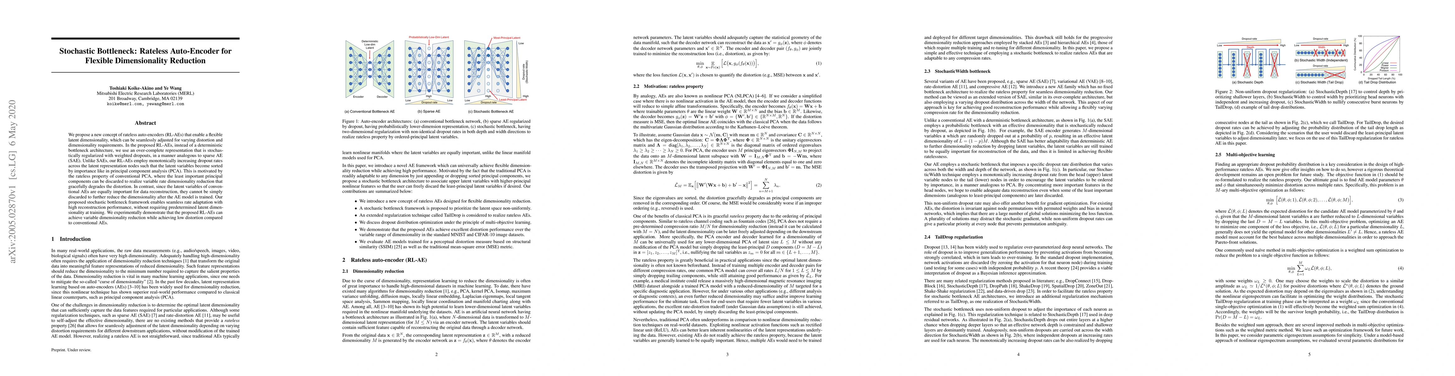 Researchers propose a new auto-encoder design called Rateless Auto-Encoder for Flexible Dimensionality Reduction, which enables variable rate dimensionality reduction while maintaining low distortion. The model uses stochastic regularization to adaptively adjust the latent dimensionality without requiring predetermined settings at training time.