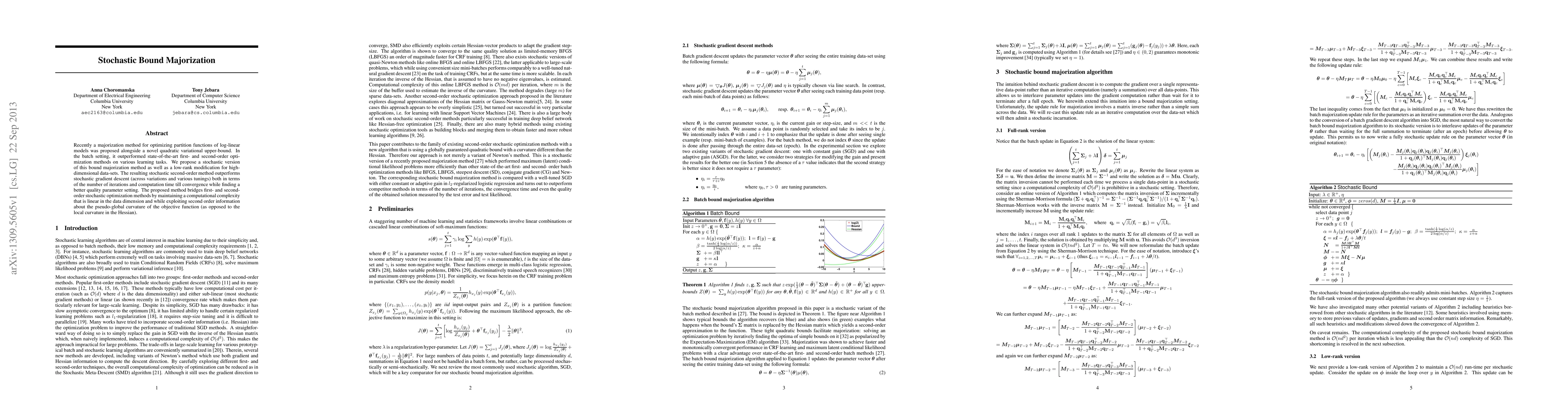 Recently a majorization method for optimizing partition functions of log-linear models was proposed alongside a novel quadratic variational upper-bound. In the batch setting, it outperformed state-of-the-art first- and second-order optimization methods on various learning tasks. We propose a stochastic version of this bound majorization method as well as a low-rank modification for high-dimensional data-sets. The resulting stochastic second-order method outperforms stochastic gradient descent (across variations and various tunings) both in terms of the number of iterations and computation time till convergence while finding a better quality parameter setting. The proposed method bridges first- and second-order stochastic optimization methods by maintaining a computational complexity that is linear in the data dimension and while exploiting second order information about the pseudo-global curvature of the objective function (as opposed to the local curvature in the Hessian).