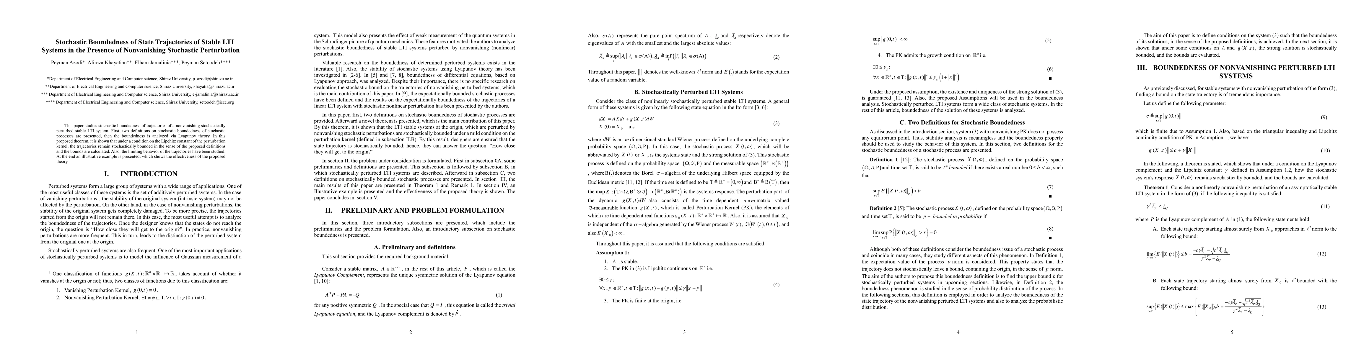 This paper studies stochastic boundedness of trajectories of a nonvanishing stochastically perturbed stable LTI system. First, two definitions on stochastic boundedness of stochastic processes are presented, then the boundedness is analyzed via Lyapunov theory. In this proposed theorem, it is shown that under a condition on the Lipchitz constant of the perturbation kernel, the trajectories remain stochastically bounded in the sense of the proposed definitions and the bounds are calculated. Also, the limiting behavior of the trajectories have been studied. At the end an illustrative example is presented, which shows the effectiveness of the proposed theory.