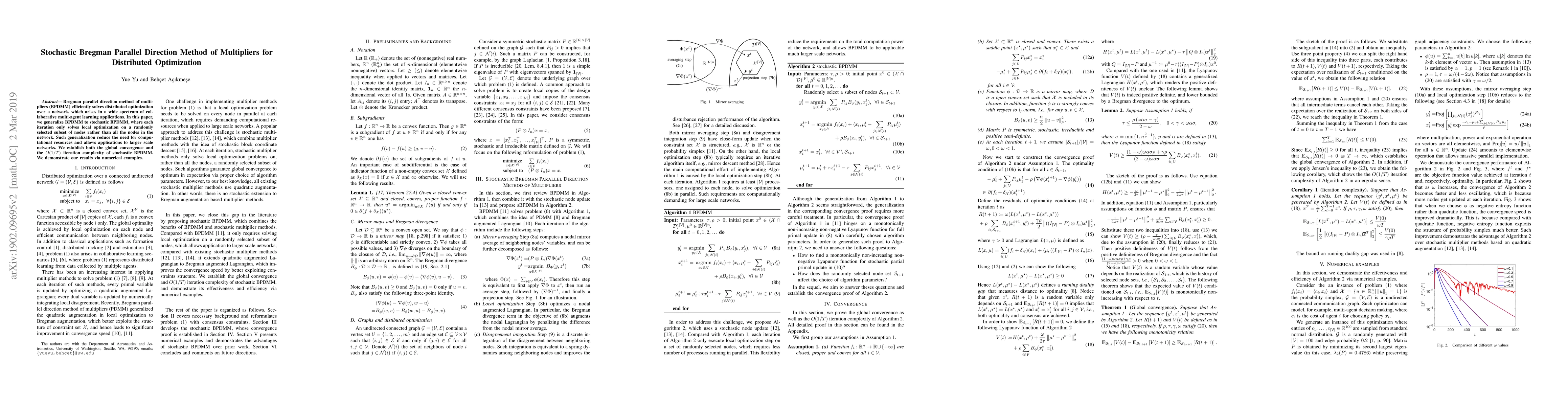 This paper generalizes the Bregman parallel direction method of multipliers (BPDMM) to a stochastic version, allowing each iteration to solve local optimization on a randomly selected subset of nodes, thus reducing computational demands and enabling scalability to larger networks. The authors prove global convergence and \(O(1/T)\) iteration complexity, and validate their findings through numerical examples.