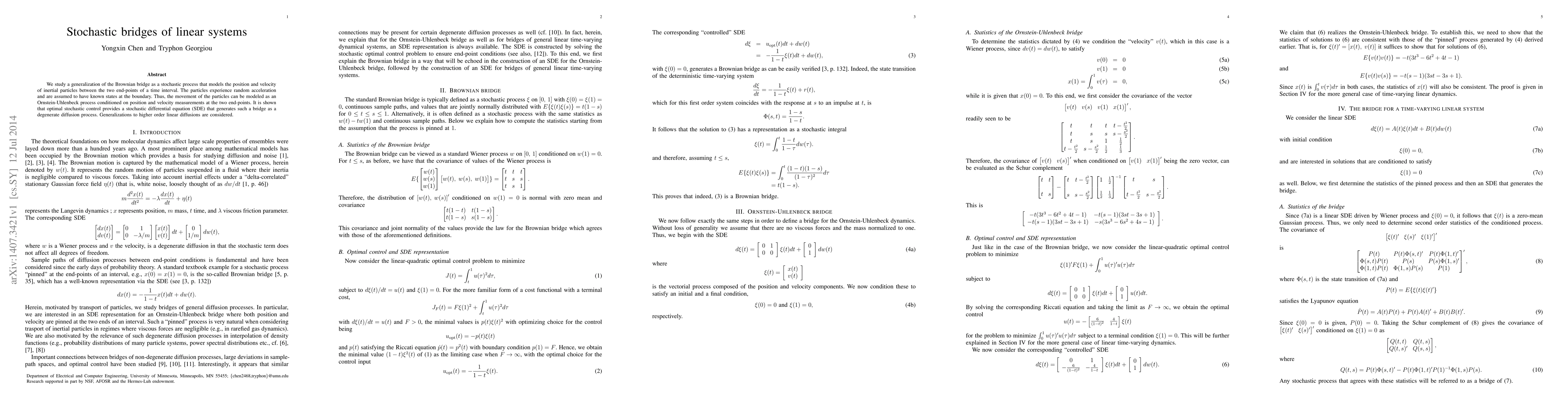This paper introduces a stochastic process called the stochastic bridge, which models the position and velocity of particles between two endpoints, with random acceleration and boundary conditions. It shows that optimal control can generate this process as a degenerate diffusion process.