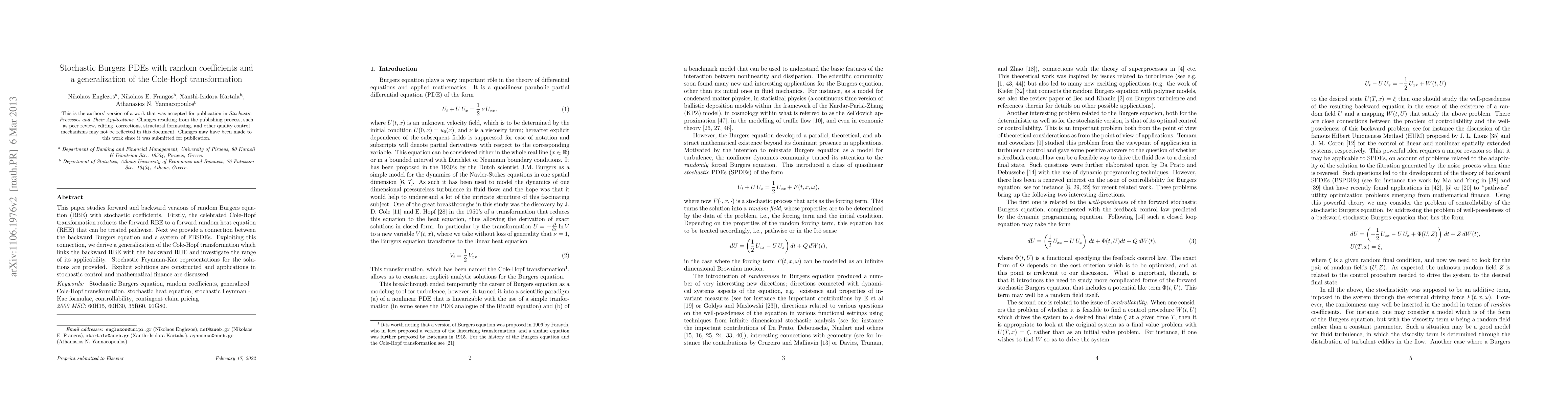 This paper investigates random Burgers equations (RBE) with stochastic coefficients, applying the Cole-Hopf transformation to reduce the forward RBE to a random heat equation. It also connects the backward RBE to a system of FBSDEs, deriving a generalized Cole-Hopf transformation for the backward RBE and exploring its applications in stochastic control and finance.