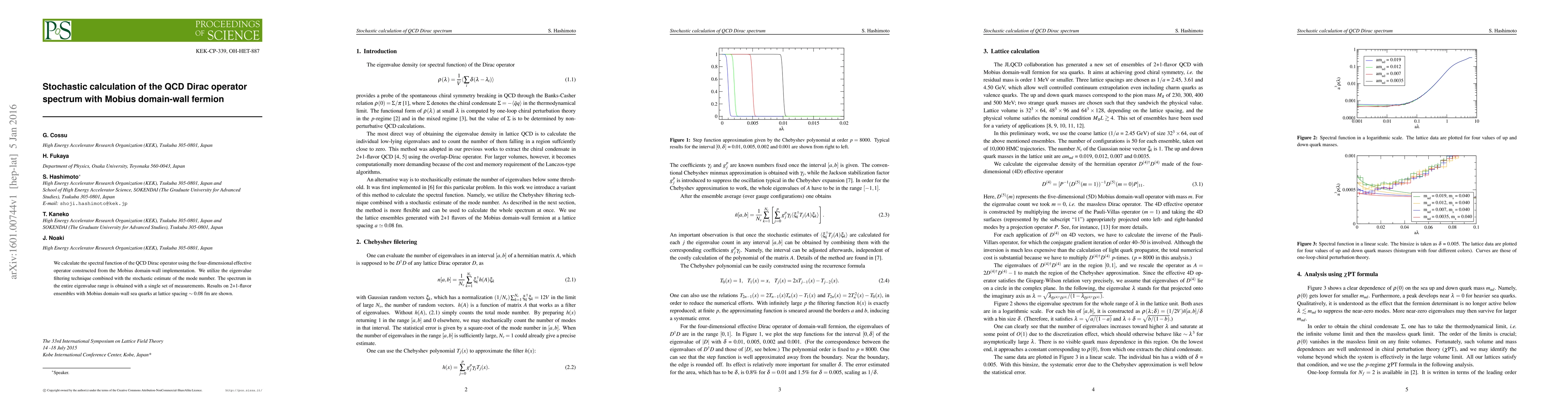 We calculate the spectral function of the QCD Dirac operator using the four-dimensional effective operator constructed from the Mobius domain-wall implementation. We utilize the eigenvalue filtering technique combined with the stochastic estimate of the mode number. The spectrum in the entire eigenvalue range is obtained with a single set of measurements. Results on 2+1-flavor ensembles with Mobius domain-wall sea quarks at lattice spacing ~ 0.08 fm are shown.