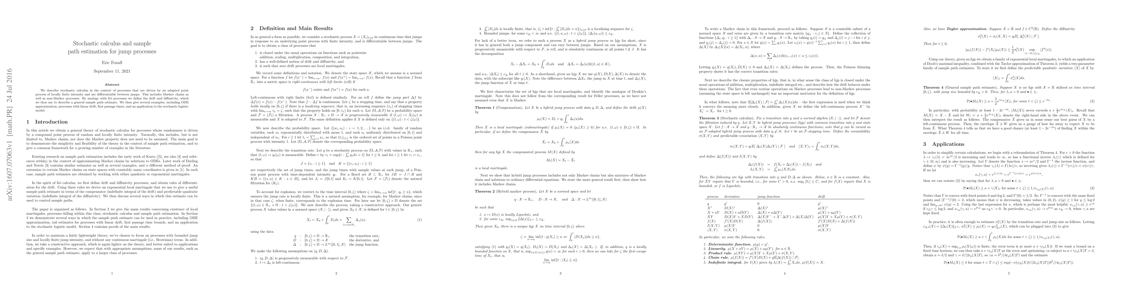 This paper develops stochastic calculus for jump processes, enabling sample path estimation using drift and diffusivity concepts. It applies this framework to various examples, including ODE approximation and the stochastic logistic model.