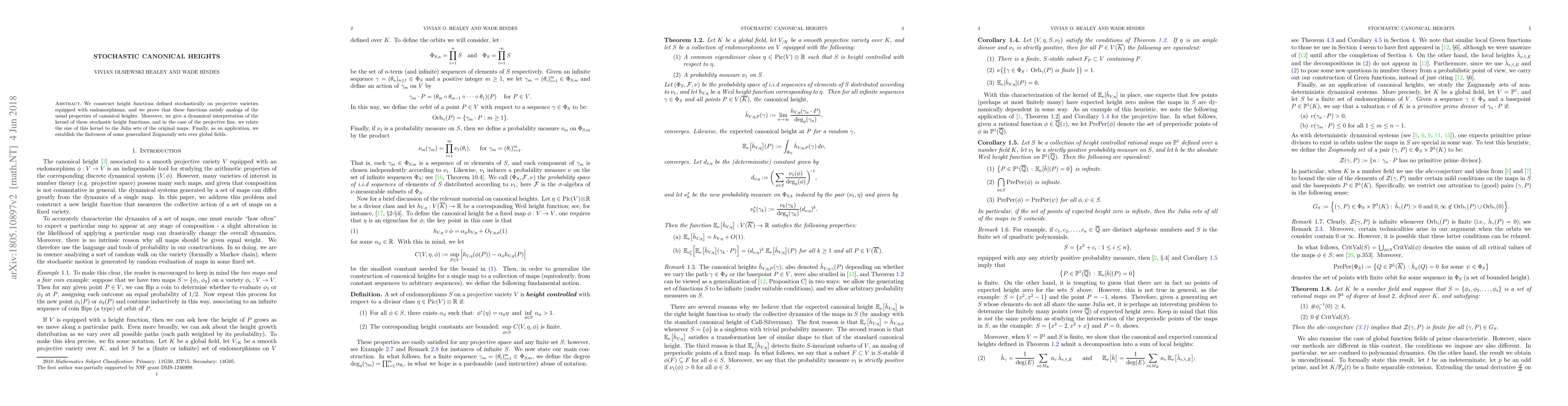 This paper constructs stochastic height functions on projective varieties with endomorphisms, proving they exhibit properties akin to canonical heights. It also links the kernel of these functions to Julia sets and applies the results to show the finiteness of certain generalized Zsigmondy sets over global fields.