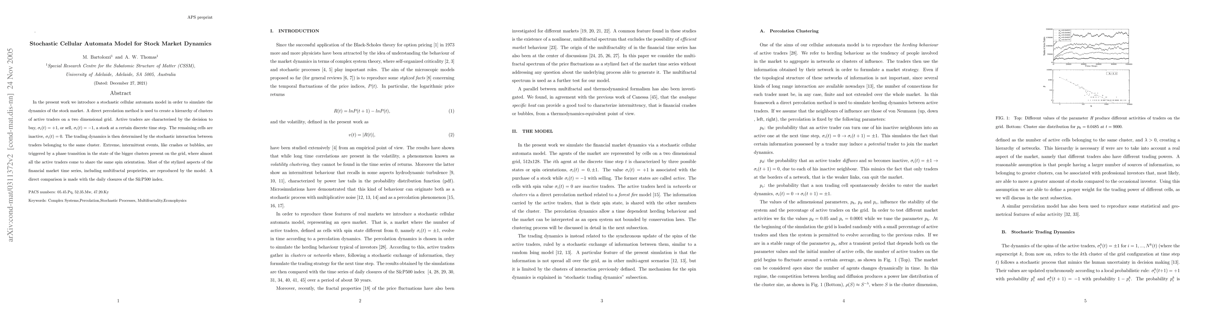 This paper proposes a stochastic cellular automata model to simulate stock market dynamics, employing a direct percolation method to form clusters of active traders who buy or sell stocks, while inactive cells remain neutral. The model effectively replicates many stylized features of financial market time series.