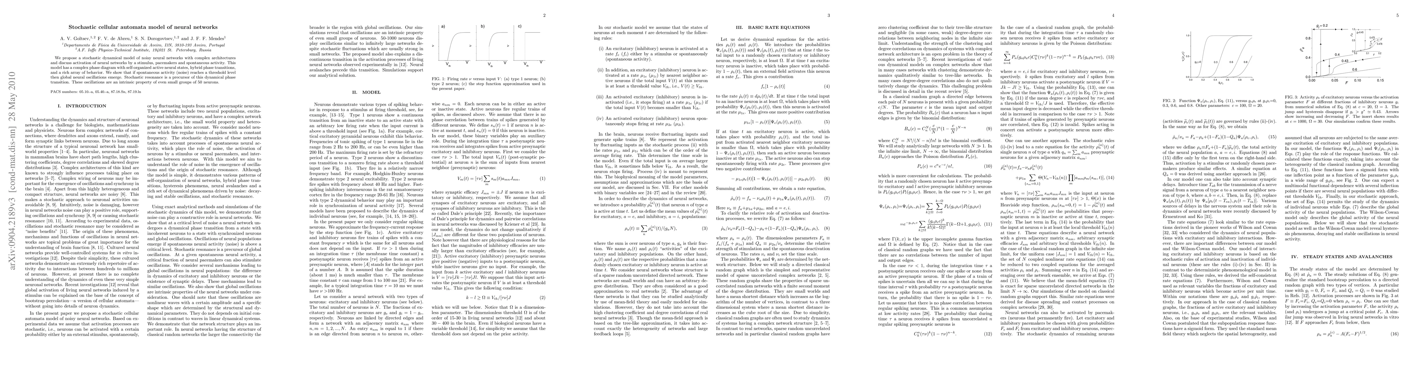 We propose a stochastic dynamical model of noisy neural networks with complex architectures and discuss activation of neural networks by a stimulus, pacemakers and spontaneous activity. This model has a complex phase diagram with self-organized active neural states, hybrid phase transitions, and a rich array of behavior. We show that if spontaneous activity (noise) reaches a threshold level then global neural oscillations emerge. Stochastic resonance is a precursor of this dynamical phase transition. These oscillations are an intrinsic property of even small groups of 50 neurons.