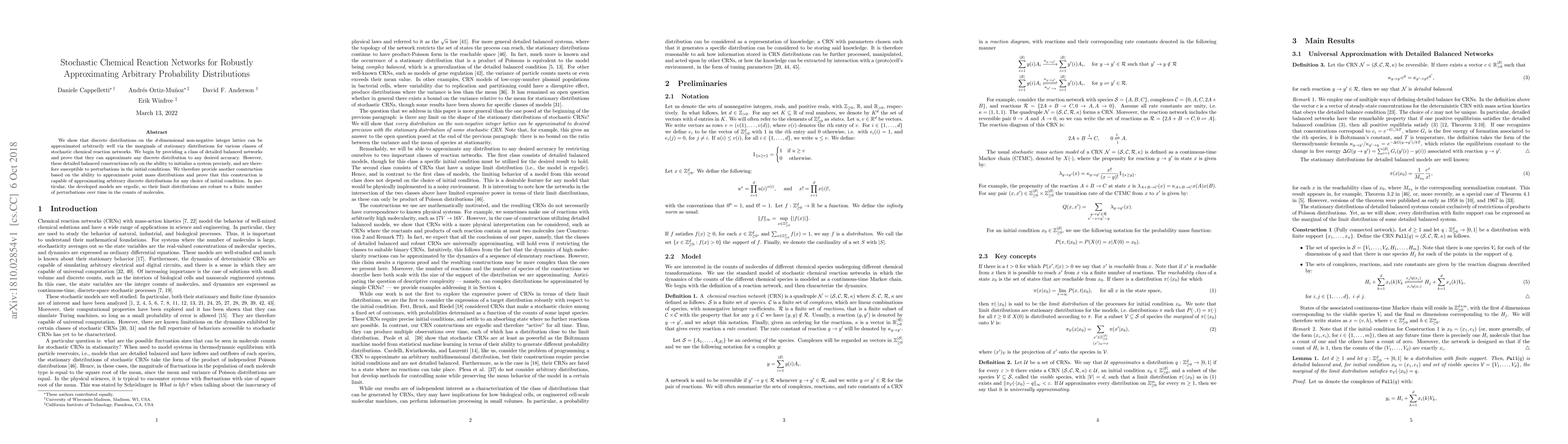 Researchers developed stochastic chemical reaction networks that can approximate arbitrary probability distributions with high accuracy, even when initial conditions are perturbed.