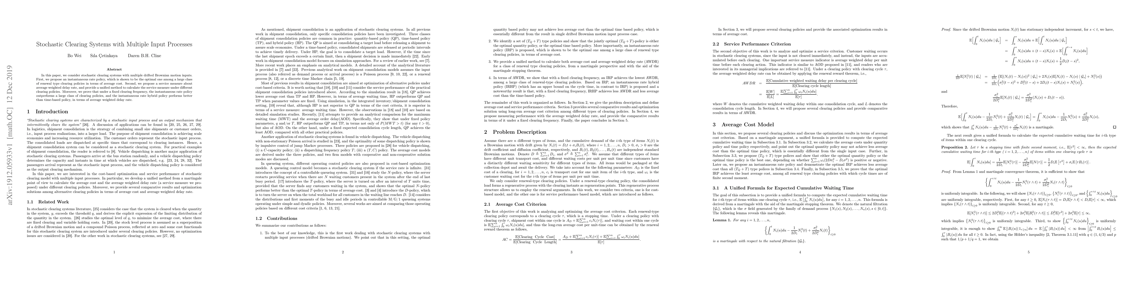 In this paper, we consider stochastic clearing systems with multiple drifted Brownian motion inputs. First, we propose an instantaneous rate policy, which is shown to be the optimal one among a large class of renewal type clearing policies in terms of average cost. Second, we propose a service measure about average weighted delay rate, and provide a unified method to calculate the service measure under different clearing policies. Moreover, we prove that under a fixed clearing frequency, the instantaneous rate policy outperforms a large class of clearing policies, and the instantaneous rate hybrid policy performs better than time-based policy, in terms of average weighted delay rate.