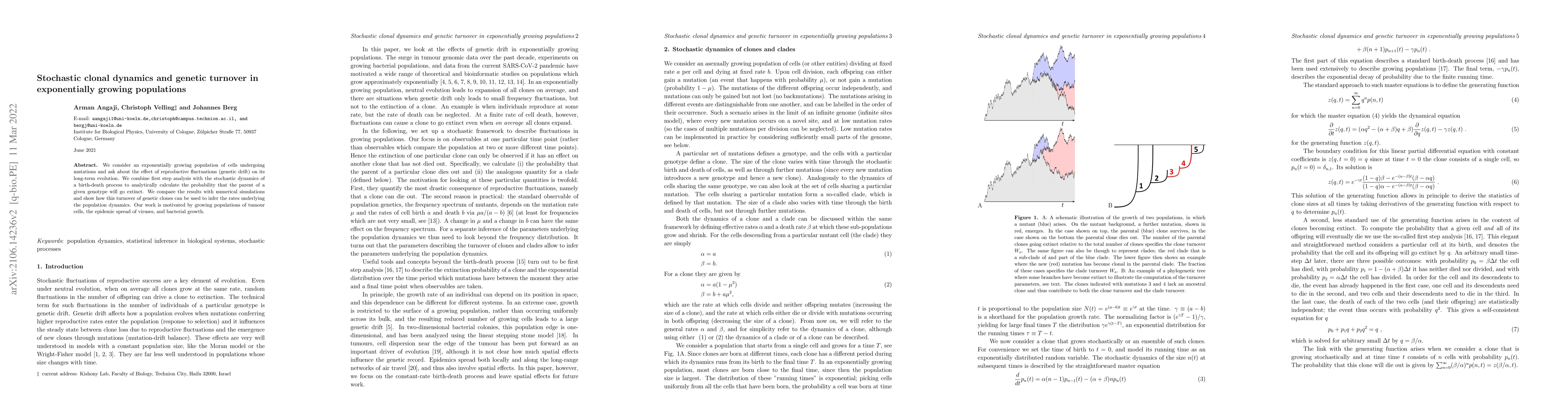 We consider an exponentially growing population of cells undergoing mutations and ask about the effect of reproductive fluctuations (genetic drift) on its long-term evolution. We combine first step analysis with the stochastic dynamics of a birth-death process to analytically calculate the probability that the parent of a given genotype will go extinct. We compare the results with numerical simulations and show how this turnover of genetic clones can be used to infer the rates underlying the population dynamics. Our work is motivated by growing populations of tumour cells, the epidemic spread of viruses, and bacterial growth.