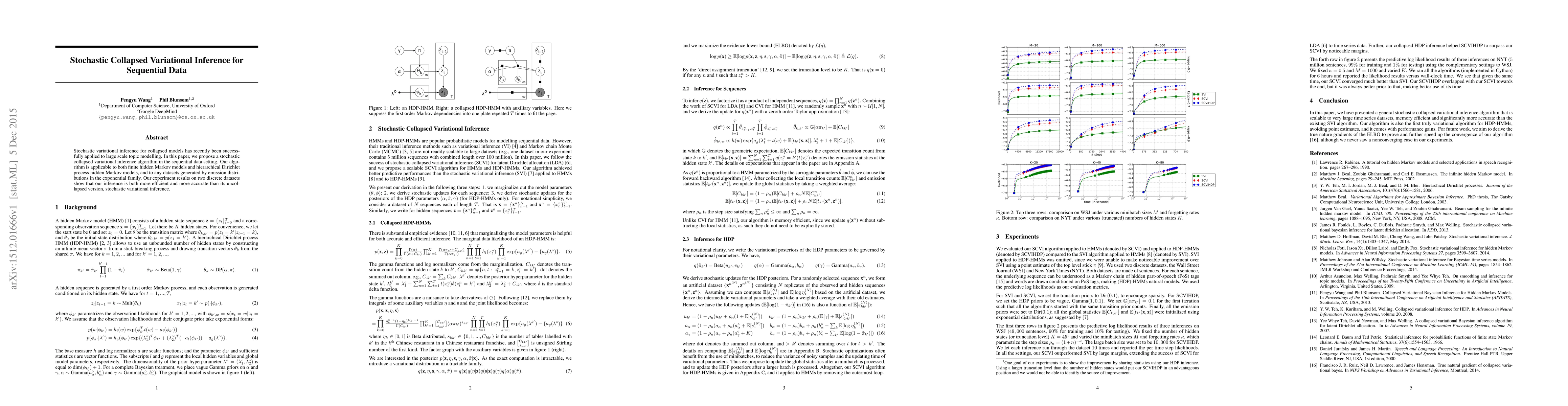 This paper introduces a new stochastic collapsed variational inference algorithm for sequential data, demonstrating its efficiency and accuracy over traditional uncollapsed methods in large-scale topic modeling tasks. The algorithm works for both finite hidden Markov models and hierarchical Dirichlet process hidden Markov models.