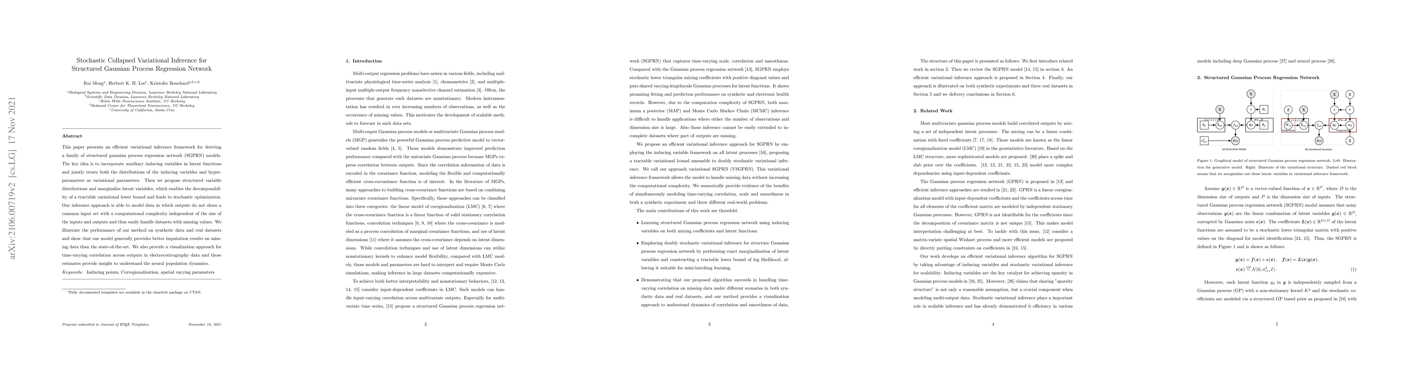 This paper introduces a stochastic collapsed variational inference framework for structured Gaussian process regression networks, utilizing auxiliary inducing variables and structured variable distributions to achieve computational efficiency and effective handling of missing data. The proposed method outperforms state-of-the-art imputation results and provides insights into neural population dynamics through time-varying correlation visualization.