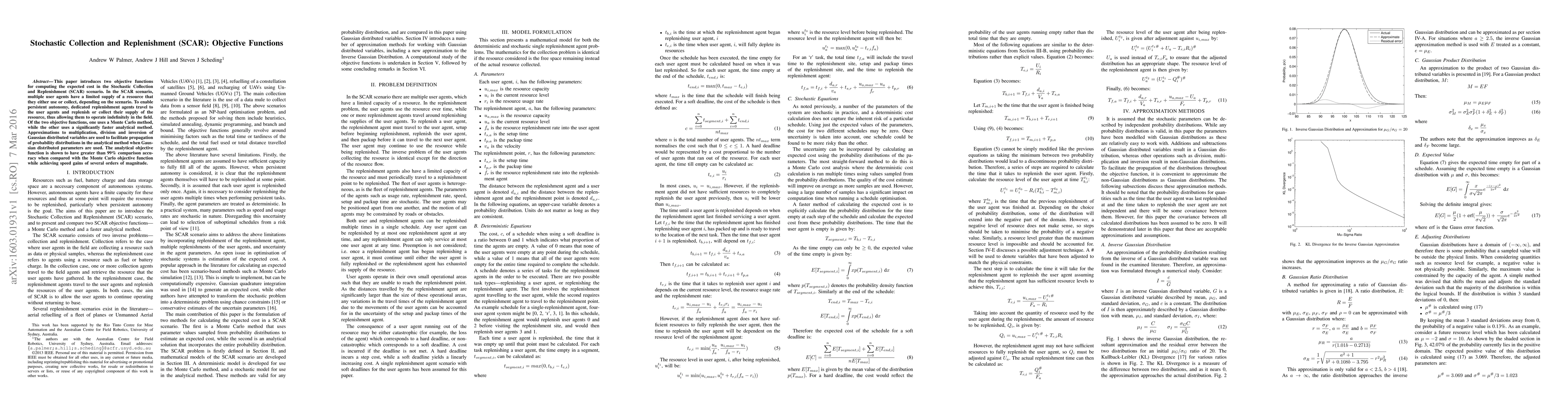 This paper introduces two objective functions for computing the expected cost in the Stochastic Collection and Replenishment (SCAR) scenario. In the SCAR scenario, multiple user agents have a limited supply of a resource that they either use or collect, depending on the scenario. To enable persistent autonomy, dedicated replenishment agents travel to the user agents and replenish or collect their supply of the resource, thus allowing them to operate indefinitely in the field. Of the two objective functions, one uses a Monte Carlo method, while the other uses a significantly faster analytical method. Approximations to multiplication, division and inversion of Gaussian distributed variables are used to facilitate propagation of probability distributions in the analytical method when Gaussian distributed parameters are used. The analytical objective function is shown to have greater than 99% comparison accuracy when compared with the Monte Carlo objective function while achieving speed gains of several orders of magnitude.