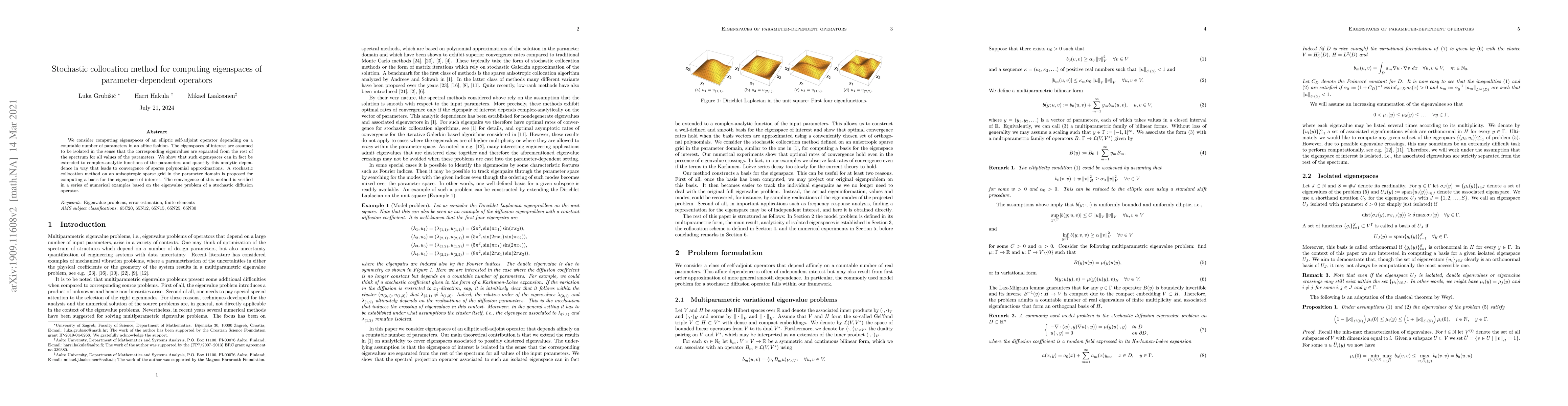 We consider computing eigenspaces of an elliptic self-adjoint operator depending on a countable number of parameters in an affine fashion. The eigenspaces of interest are assumed to be isolated in the sense that the corresponding eigenvalues are separated from the rest of the spectrum for all values of the parameters. We show that such eigenspaces can in fact be extended to complex-analytic functions of the parameters and quantify this analytic dependence in way that leads to convergence of sparse polynomial approximations. A stochastic collocation method on an anisoptropic sparse grid in the parameter domain is proposed for computing a basis for the eigenspace of interest. The convergence of this method is verified in a series of numerical examples based on the eigenvalue problem of a stochastic diffusion operator.