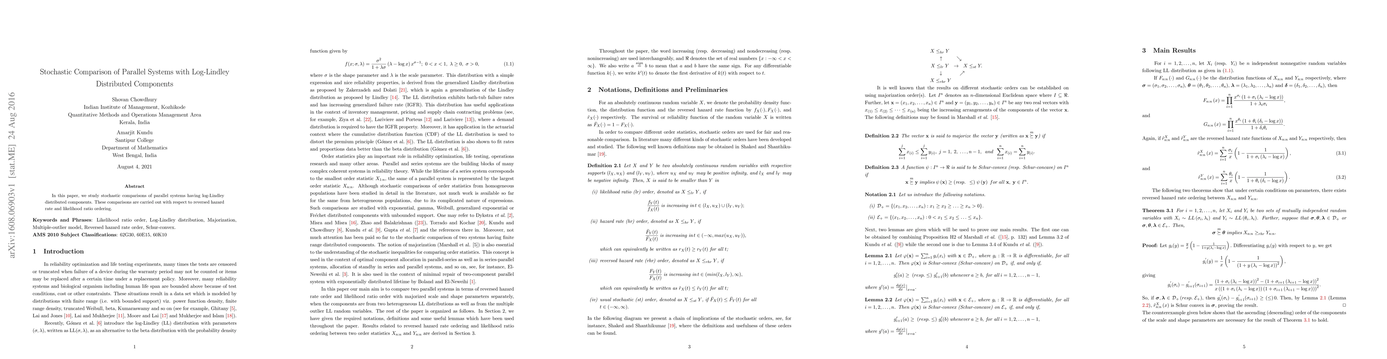 This paper explores stochastic comparisons of parallel systems where components follow log-Lindley distribution, focusing on reversed hazard rate and likelihood ratio ordering for performance analysis.