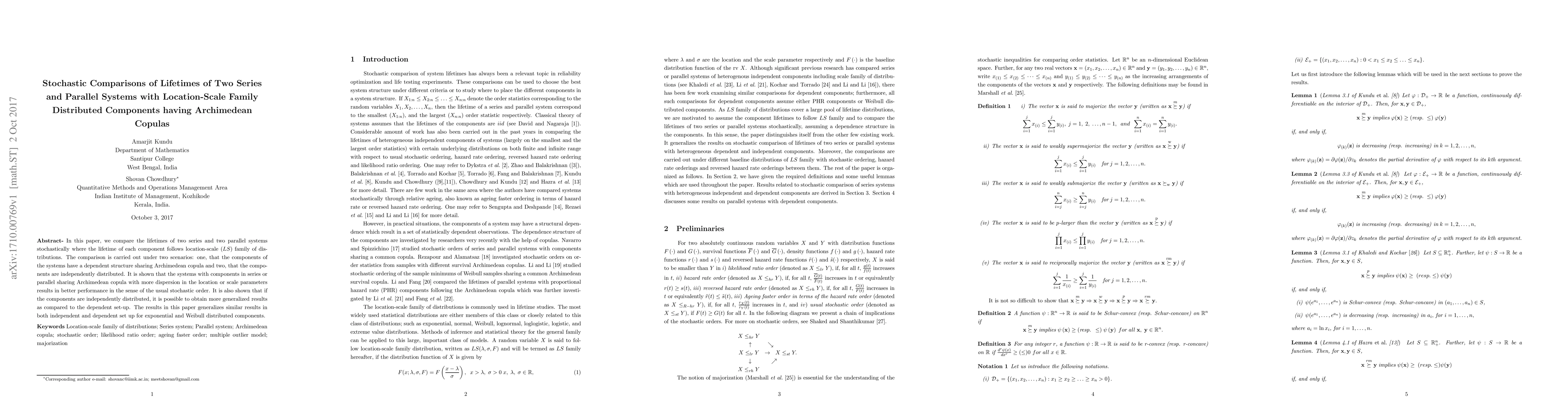 This paper compares the lifetimes of series and parallel systems with components following location-scale distributions and either sharing Archimedean copulas or being independently distributed. It finds that systems with more dispersion in location or scale parameters perform better under the Archimedean copula scenario, while independent components yield more generalized results.