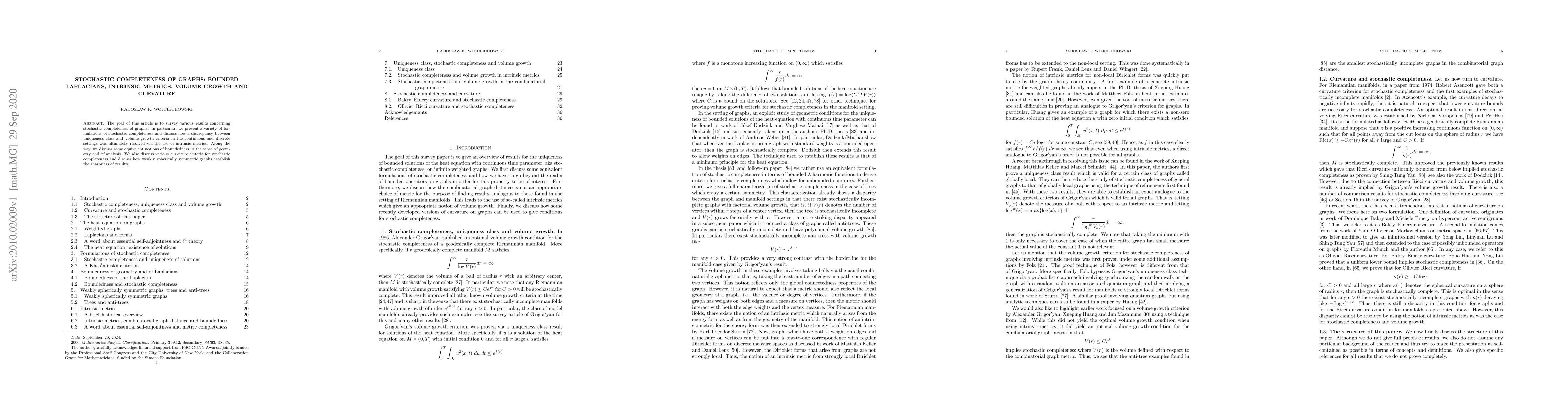 This paper surveys results on stochastic completeness of graphs, resolving discrepancies between uniqueness class and volume growth criteria using intrinsic metrics, and highlighting the role of weakly spherically symmetric graphs in establishing sharpness of results.