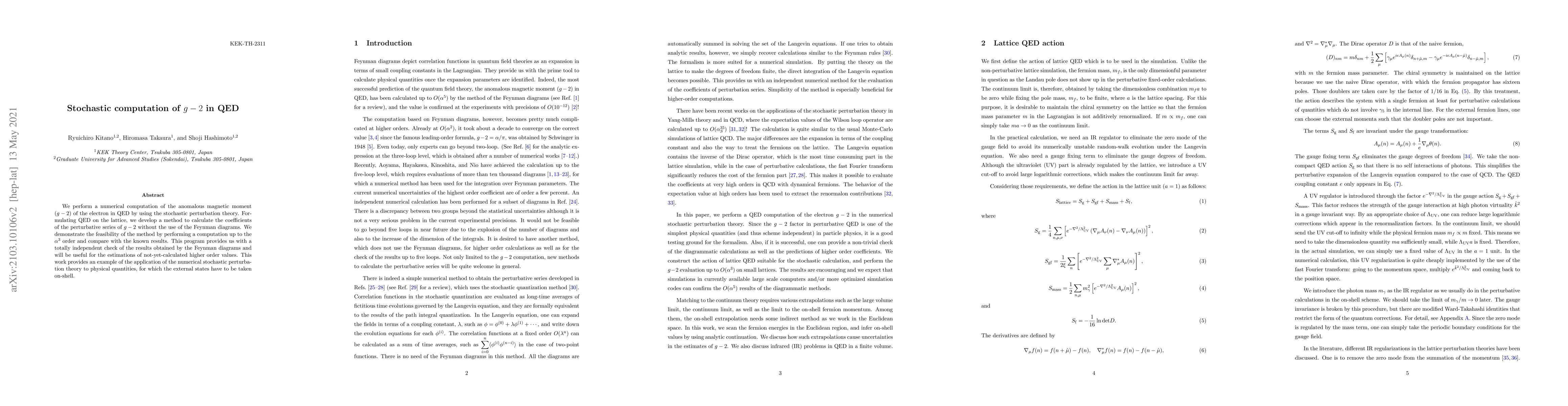 This paper employs stochastic perturbation theory to compute the electron's anomalous magnetic moment ($g-2$) in QED, bypassing Feynman diagrams. The authors demonstrate the method's viability by calculating up to the $\alpha^3$ order and compare results with established values, offering a new approach for estimating higher-order terms.
