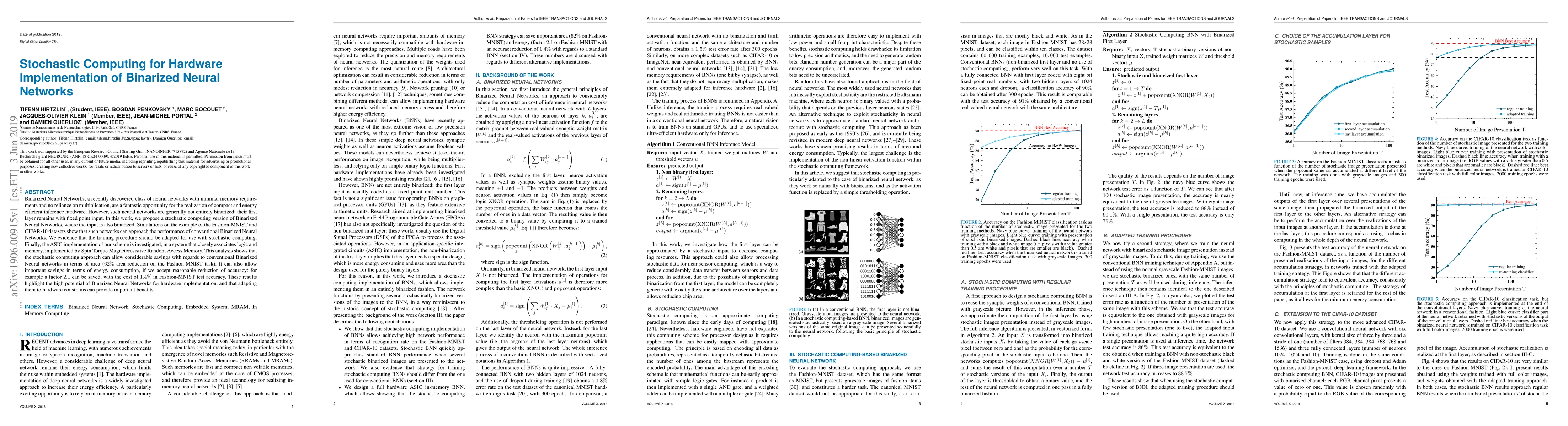 This paper proposes a stochastic computing version of Binarized Neural Networks, which fully binarizes input to achieve compact and energy-efficient hardware implementation. Simulations demonstrate comparable performance and significant area and energy savings, particularly when using Spin Torque Magnetoresistive RAM, showing the potential of Binarized Neural Networks in hardware.