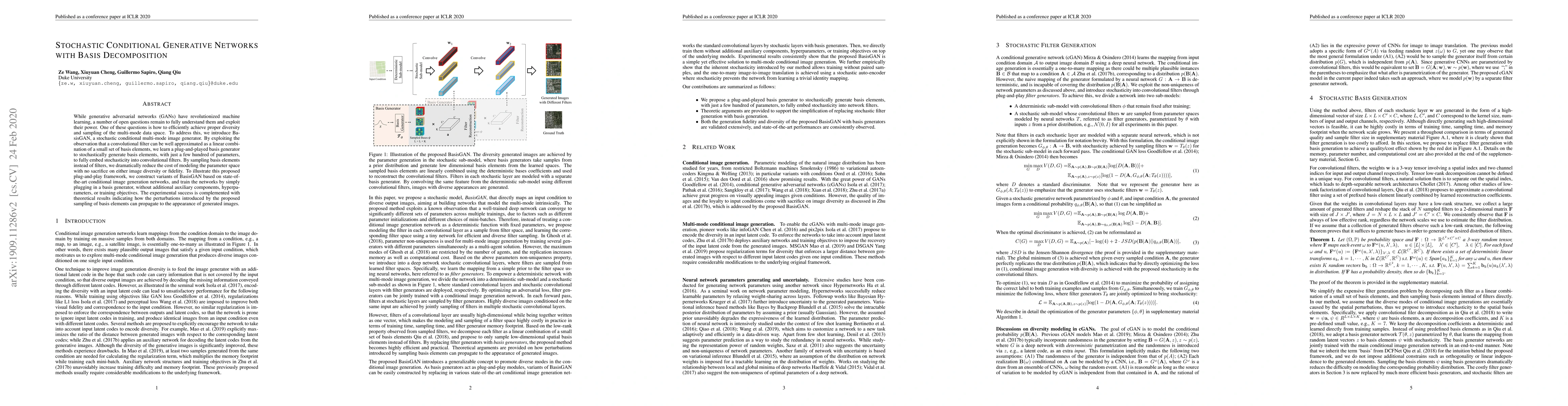 While generative adversarial networks (GANs) have revolutionized machine learning, a number of open questions remain to fully understand them and exploit their power. One of these questions is how to efficiently achieve proper diversity and sampling of the multi-mode data space. To address this, we introduce BasisGAN, a stochastic conditional multi-mode image generator. By exploiting the observation that a convolutional filter can be well approximated as a linear combination of a small set of basis elements, we learn a plug-and-played basis generator to stochastically generate basis elements, with just a few hundred of parameters, to fully embed stochasticity into convolutional filters. By sampling basis elements instead of filters, we dramatically reduce the cost of modeling the parameter space with no sacrifice on either image diversity or fidelity. To illustrate this proposed plug-and-play framework, we construct variants of BasisGAN based on state-of-the-art conditional image generation networks, and train the networks by simply plugging in a basis generator, without additional auxiliary components, hyperparameters, or training objectives. The experimental success is complemented with theoretical results indicating how the perturbations introduced by the proposed sampling of basis elements can propagate to the appearance of generated images.