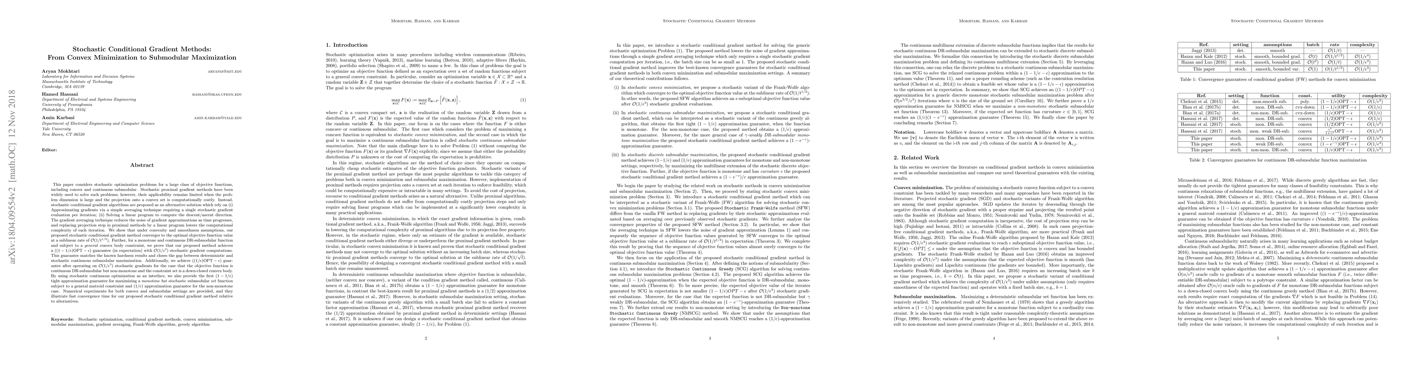 This paper proposes stochastic conditional gradient methods for solving large-scale convex and submodular optimization problems, achieving sublinear convergence rates and tight approximation guarantees. The method approximates gradients and replaces costly projections with linear programming, significantly reducing computational complexity.