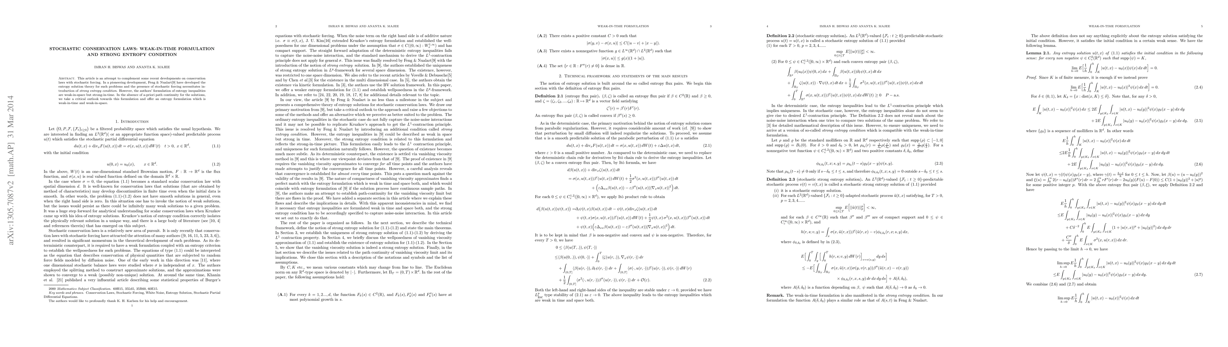 This article is an attempt to complement some recent developments on conservation laws with stochastic forcing. In a pioneering development, Feng $&$ Nualarthave developed the entropy solution theory for such problems and the presence of stochastic forcing necessitates introduction of {\it strong entropy condition}. However, the authors' formulation of entropy inequalities are weak-in-space but strong-in-time. In the absence of a-priori path continuity for the solutions, we take a critical outlook towards this formulation and offer an entropy formulation which is weak-in-time and weak-in-space.