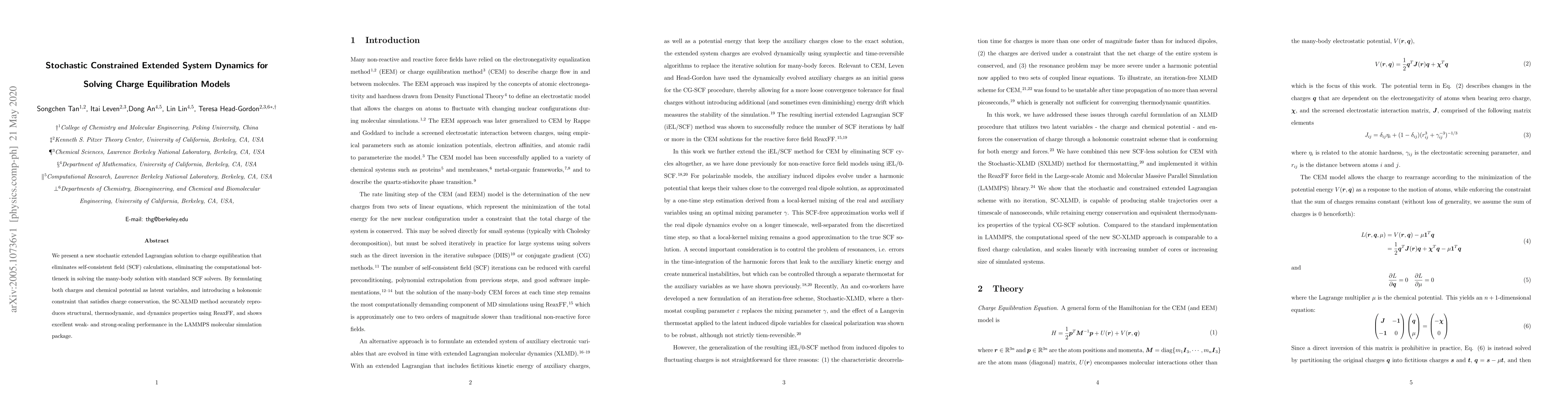 We present a new stochastic extended Lagrangian solution to charge equilibration that eliminates self-consistent field (SCF) calculations, eliminating the computational bottleneck in solving the many-body solution with standard SCF solvers. By formulating both charges and chemical potential as latent variables, and introducing a holonomic constraint that satisfies charge conservation, the SC-XLMD method accurately reproduces structural, thermodynamic, and dynamics properties using ReaxFF, and shows excellent weak- and strong-scaling performance in the LAMMPS molecular simulation package.