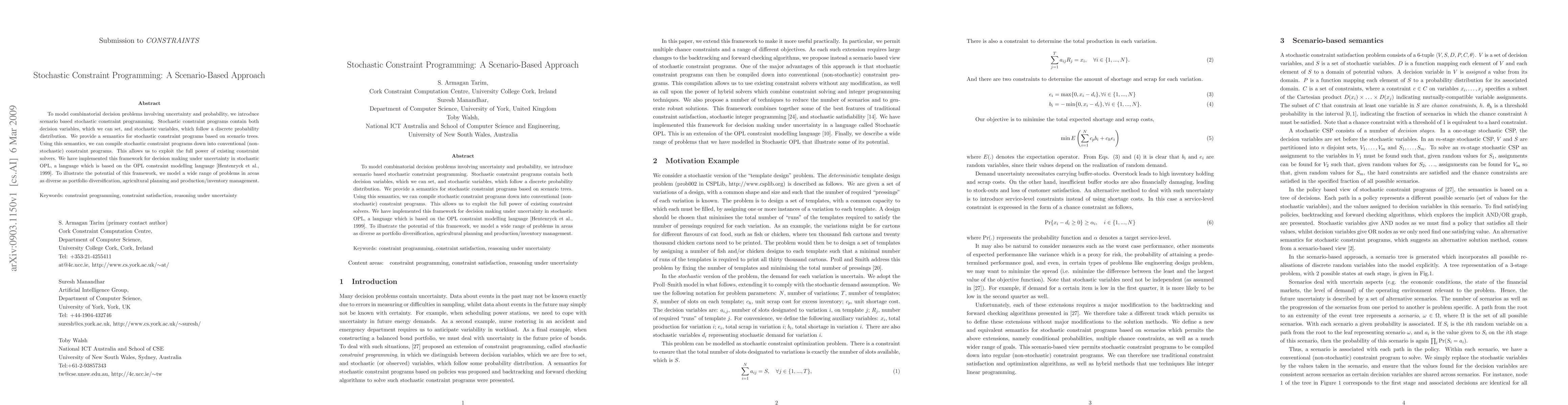 This paper introduces scenario-based stochastic constraint programming to model combinatorial decision problems with uncertainty. It compiles stochastic constraint programs into conventional constraint programs, leveraging existing solvers, and demonstrates its application in portfolio diversification, agricultural planning, and inventory management.