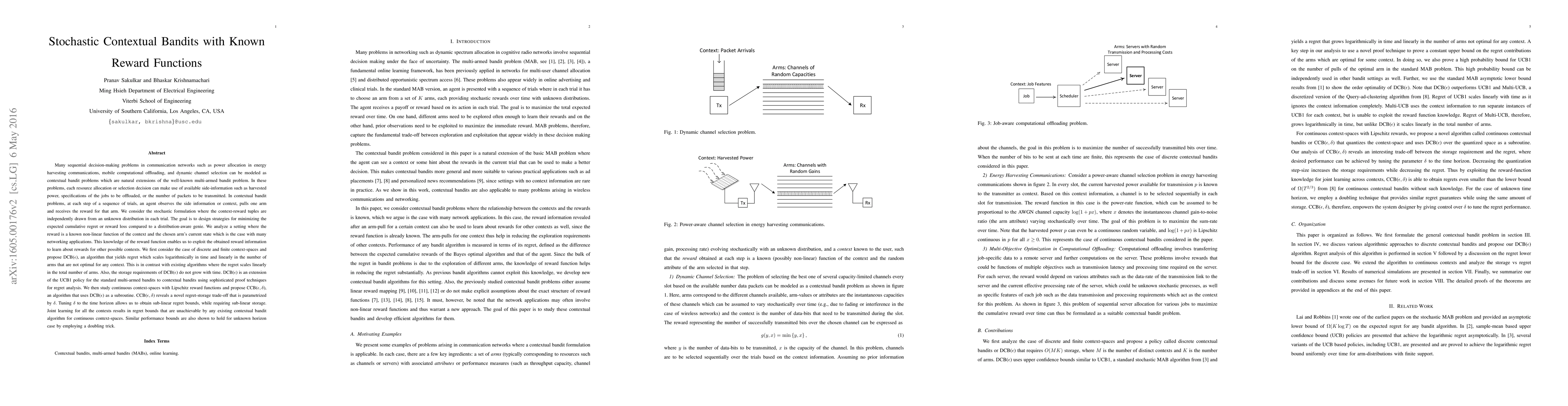 Many sequential decision-making problems in communication networks can be modeled as contextual bandit problems, which are natural extensions of the well-known multi-armed bandit problem. In contextual bandit problems, at each time, an agent observes some side information or context, pulls one arm and receives the reward for that arm. We consider a stochastic formulation where the context-reward tuples are independently drawn from an unknown distribution in each trial. Motivated by networking applications, we analyze a setting where the reward is a known non-linear function of the context and the chosen arm's current state. We first consider the case of discrete and finite context-spaces and propose DCB($\epsilon$), an algorithm that we prove, through a careful analysis, yields regret (cumulative reward gap compared to a distribution-aware genie) scaling logarithmically in time and linearly in the number of arms that are not optimal for any context, improving over existing algorithms where the regret scales linearly in the total number of arms. We then study continuous context-spaces with Lipschitz reward functions and propose CCB($\epsilon, \delta$), an algorithm that uses DCB($\epsilon$) as a subroutine. CCB($\epsilon, \delta$) reveals a novel regret-storage trade-off that is parametrized by $\delta$. Tuning $\delta$ to the time horizon allows us to obtain sub-linear regret bounds, while requiring sub-linear storage. By exploiting joint learning for all contexts we get regret bounds for CCB($\epsilon, \delta$) that are unachievable by any existing contextual bandit algorithm for continuous context-spaces. We also show similar performance bounds for the unknown horizon case.