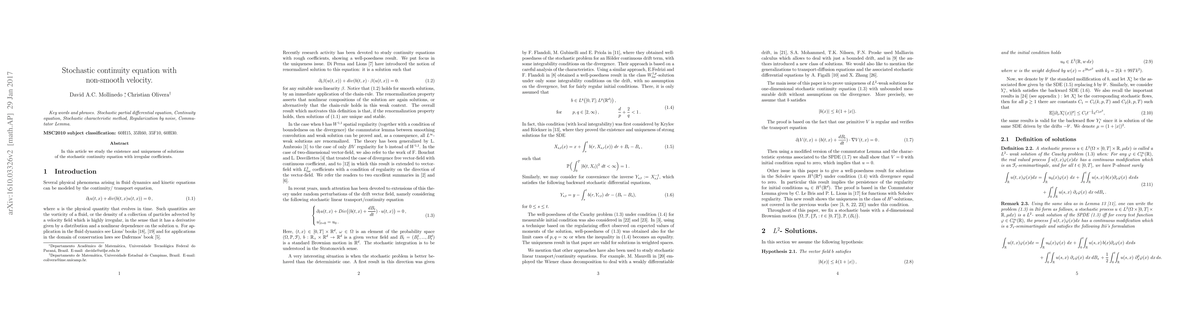 In this article we study the existence and uniqueness of solutions of stochastic continuity equation with irregular coefficients.