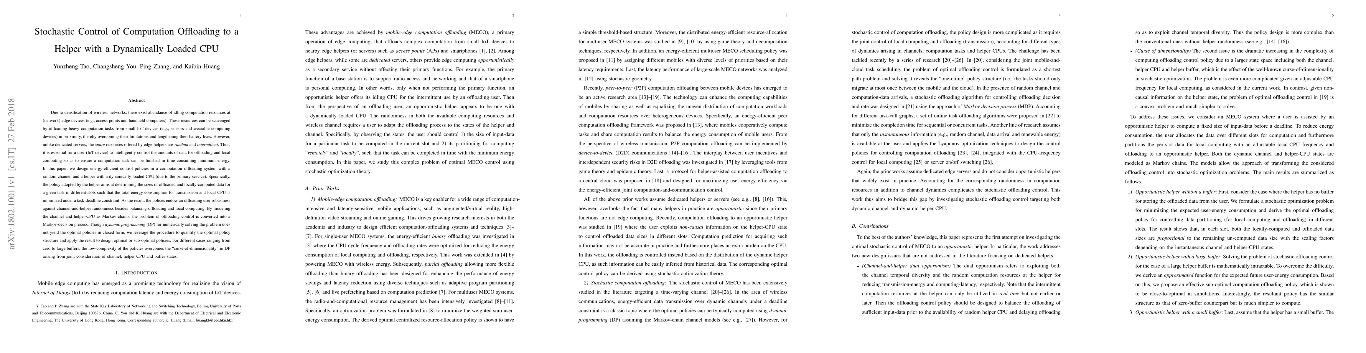 Due to densification of wireless networks, there exist abundance of idling computation resources at edge devices. These resources can be scavenged by offloading heavy computation tasks from small IoT devices in proximity, thereby overcoming their limitations and lengthening their battery lives. However, unlike dedicated servers, the spare resources offered by edge helpers are random and intermittent. Thus, it is essential for a user to intelligently control the amounts of data for offloading and local computing so as to ensure a computation task can be finished in time consuming minimum energy. In this paper, we design energy-efficient control policies in a computation offloading system with a random channel and a helper with a dynamically loaded CPU. Specifically, the policy adopted by the helper aims at determining the sizes of offloaded and locally-computed data for a given task in different slots such that the total energy consumption for transmission and local CPU is minimized under a task-deadline constraint. As the result, the polices endow an offloading user robustness against channel-and-helper randomness besides balancing offloading and local computing. By modeling the channel and helper-CPU as Markov chains, the problem of offloading control is converted into a Markov-decision process. Though dynamic programming (DP) for numerically solving the problem does not yield the optimal policies in closed form, we leverage the procedure to quantify the optimal policy structure and apply the result to design optimal or sub-optimal policies. For different cases ranging from zero to large buffers, the low-complexity of the policies overcomes the "curse-of-dimensionality" in DP arising from joint consideration of channel, helper CPU and buffer states.