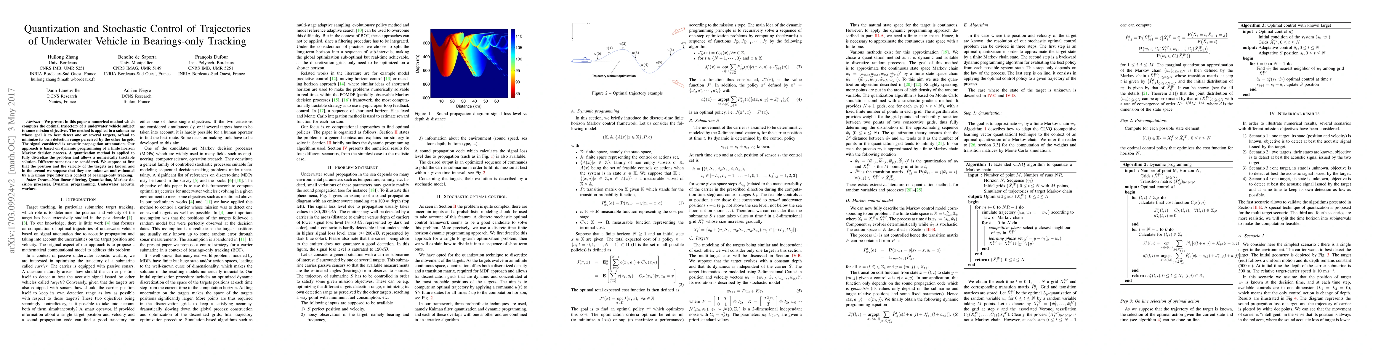 We present in this paper a numerical method which computes the optimal trajectory of a underwater vehicle subject to some mission objectives. The method is applied to a submarine whose goal is to best detect one or several targets, or/and to minimize its own detection range perceived by the other targets. The signal considered is acoustic propagation attenuation. Our approach is based on dynamic programming of a finite horizon Markov decision process. A quantization method is applied to fully discretize the problem and allows a numerically tractable solution. Different scenarios are considered. We suppose at first that the position and the velocity of the targets are known and in the second we suppose that they are unknown and estimated by a Kalman type filter in a context of bearings-only tracking.