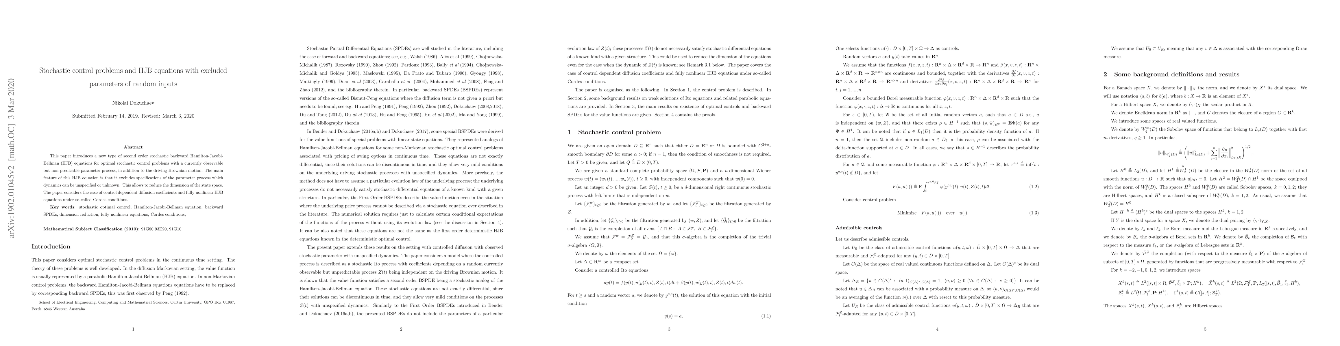 The paper introduces a new type of second-order stochastic backward HJB equations for optimal stochastic control problems, excluding specifications of a currently observable but unpredictable parameter process, thus reducing the dimension of the state space.