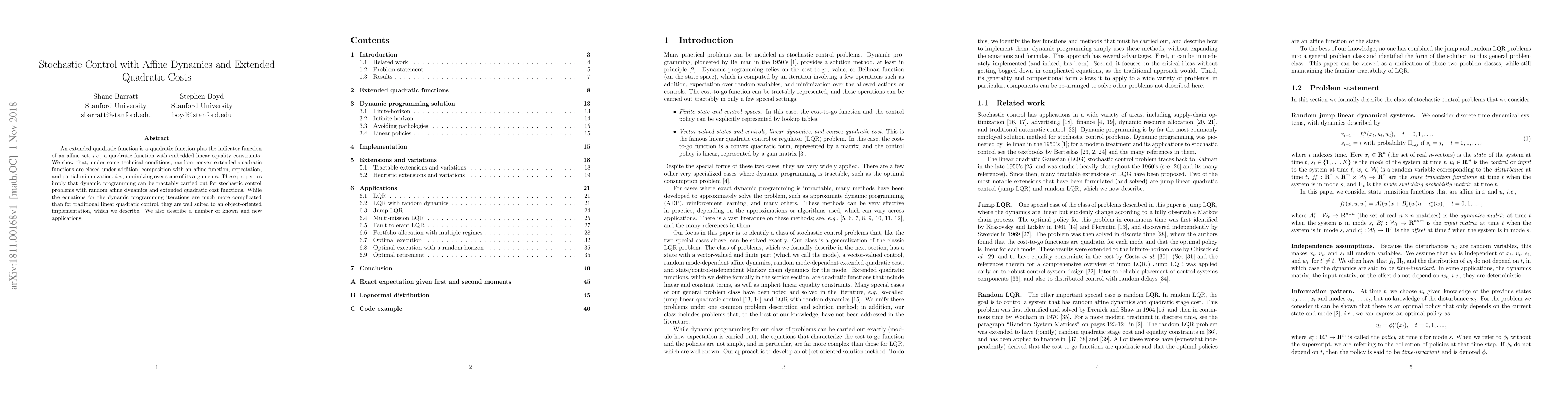 This paper explores stochastic control problems with affine dynamics and extended quadratic costs, proving that under certain conditions, these functions maintain closure under various operations, enabling tractable dynamic programming. The complexity of the equations is addressed through an object-oriented implementation, with applications discussed.