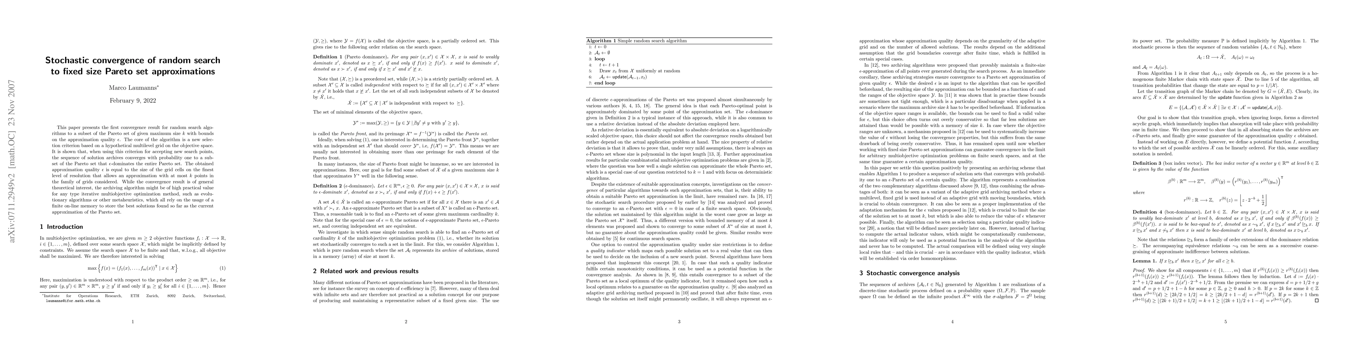 This paper establishes the first convergence result for random search algorithms to a fixed size Pareto set approximation, demonstrating the convergence to an epsilon-dominating subset with bounds on approximation quality. The algorithm uses a new selection criterion based on a multilevel grid, showing practical value for iterative multiobjective optimization methods.